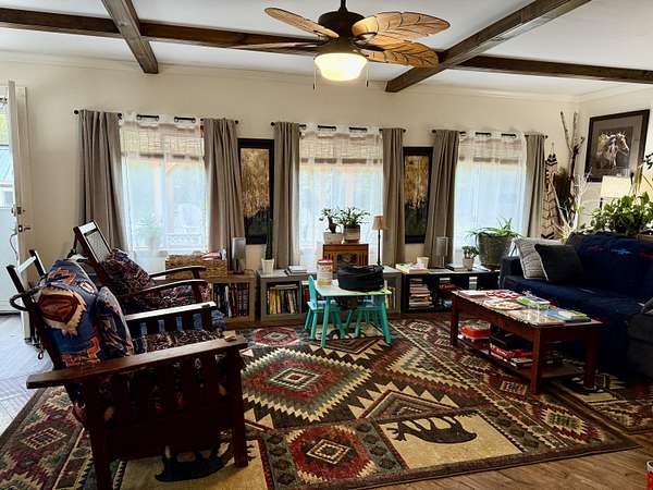 - Beamed Ceilings, Built-In Features, Ceiling Fan(s), Kitchen Island, Natural Woodwork, Open Floorplan, Pantry