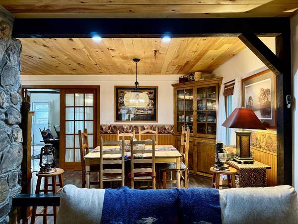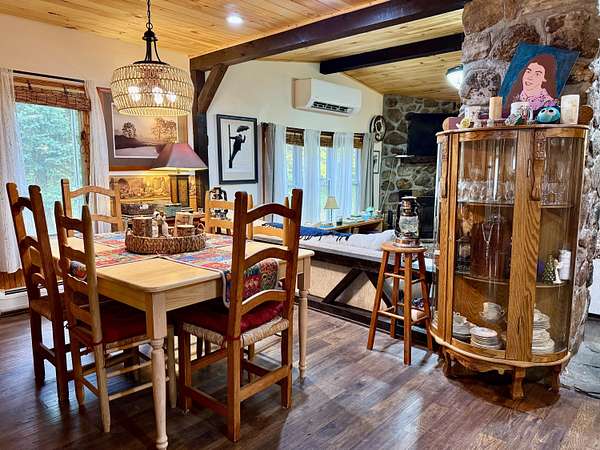 Welcome to your private wooded retreat nestled on over 7 acres - the perfect balance of seclusion and convenience. This beautifully updated 3-bedroom, 1-bath ranch offers the peace and privacy of country living while remaining close to all local amenities. A long, tree-lined drive leads to the home, complete with a spacious detached garage and a looping driveway for easy access and parking. Inside, you'll find a warm, inviting interior featuring stone and wood accents throughout, complemented by a wood-burning fireplace that adds cozy charm to the open living space. The open-concept kitchen, living, and dining area creates a natural flow ideal for both everyday living and entertaining. The kitchen features stone countertops and modern finishes that blend beautifully with the home's rustic character. Comfort is enhanced year-round with mini-split systems throughout, offering efficient heating and cooling. A large den or bonus room provides versatile potential - perfect for a home office, family room, or creative studio. This one-of-a-kind property offers the rare opportunity to enjoy tranquility, comfort, and space, just minutes from town conveniences.