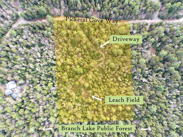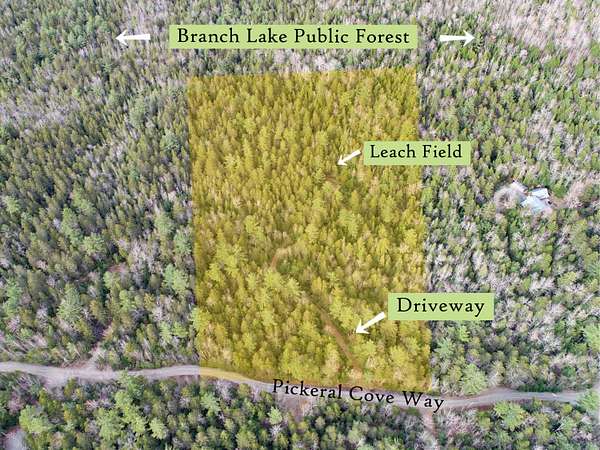 A level of solitude that can take years to find resides here. This 6 acre wooded parcel lies directly across a quiet gravel road from Branch Lake, one of the finer fresh water bodies in Hancock County. Access to Branch is afforded via deeded rights to a 100' lake lot, complete with parking and dock. This deeded lake access is a short walk away and shared with only 4 other lots. Beyond the incredible seclusion and recreational lake access on offer, the 6 acre lot is thickly wooded, with natural habitat all around, and provides existing infrastructure of a 540'+/- driveway, 3 power poles & lines installed and a septic leach field already on site that is sized for a 3 bedroom home plus a 1 bedroom apartment (design & inspection report available). The boundaries are also freshly surveyed. The rear of the property abuts conserved Ellsworth Public Forest, ensuring that the wild surrounds stay very much wild. The build site being high & dry allows for optimal home placement. Located in the private "Phillips Way" neighborhood, this surrounding rural community is one of the most desirable and organized on Branch Lake. Located about half way between Ellsworth & Bangor, city amenities are in either direction with the treasures Acadia National Park being about a 45 minute drive. Enjoy living on Branch Lake at a fraction of the cost with this forested home site. Be sure to check out the video tour that walks you all around the property and down to the lake access.