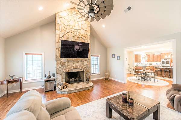 Custom bult home on 5 acres. The gourmet kitchen is a chef's dream, offers a gas stove, tons of counter and cabinet space, breathtaking 3/4" Birch hardwood floors, 20' ceilings in living area with stone wood burning fireplace and wet bar, cedar closets in bedrooms, tile bath's, Large master bath with separate vanities, Heated Florida room, large decks on back of home, Halo 5" water filter system, Tankless water heater, 9' ceilings in downstairs family/media center, large laundry area with sink, abundance of storage, wooden blinds with remotes, 2 HVAC units, 3 car heated garage, energy efficient windows, 6" thick walls w/foam insulation, stone retainer wall, plus underground utilities.