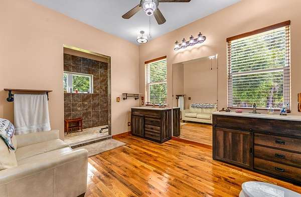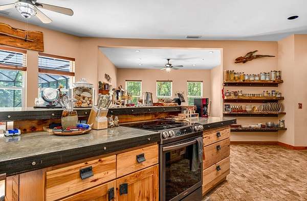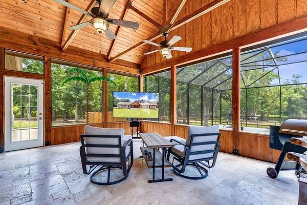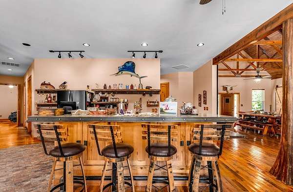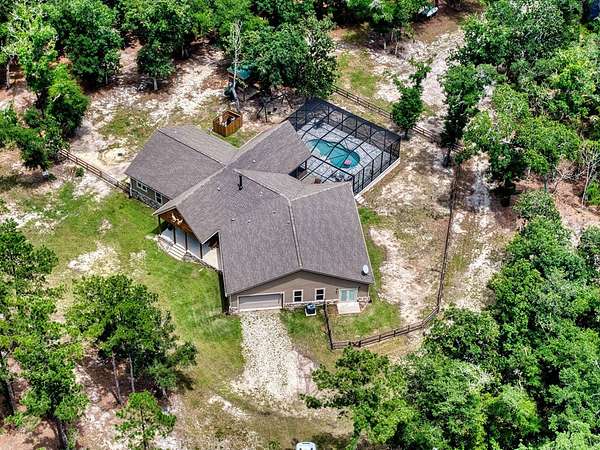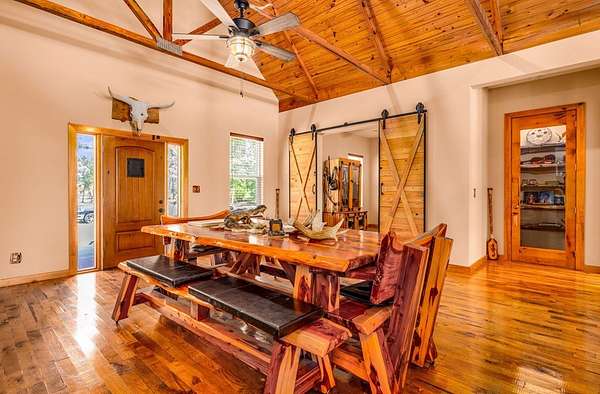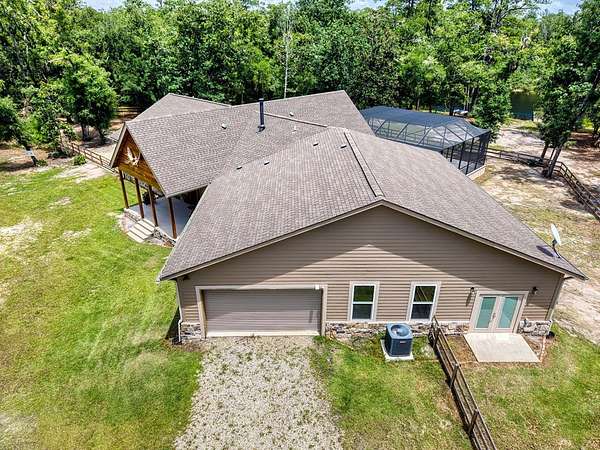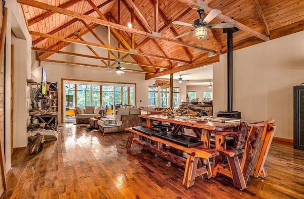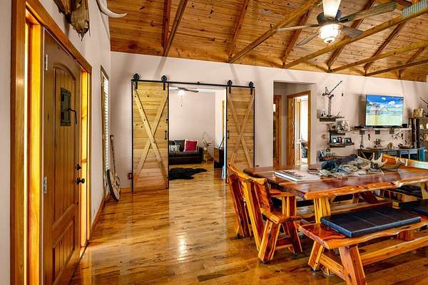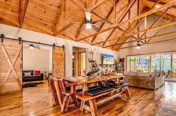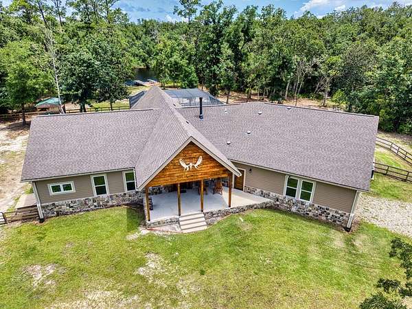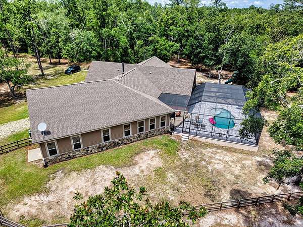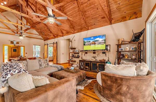 Breathtaking Country Estate on 40 Acres with 2,500' of Riverfront! Welcome to the home of your dreams!, a truly one-of-a-kind country estate nestled on 40 pristine acres with 2,500 feet of private riverfront. Amazing views of your private riverfront and pool from 2 stunning open concept living areas and kitchen-dining area. This property is a rare find, offering the perfect blend of modern luxury, rustic charm, and outdoor adventure. Property Highlights include: Interior Features Kitchen: Hickory cabinets, Concrete countertops, Live edge cedar & oak shelving, Living Spaces: Solid knotty pine interior with 8' doors, Tile and oak flooring, 10' ceilings ,Ceiling fans throughout, Wood-burning stove, Large ice machine Windows & Doors: Pella windows & triple sliding door French doors with internal blinds, Skylights in lodge, laundry, 2 1/2 bath, 2 car garage Bathrooms: 3 Kohler power flush toilets, primary bath has a double sized floor to ceiling tiled shower, a seating-dressing area with double vanities, Utilities & Systems: Goodman HVAC systems (2.5 ton & 3.5 ton) 400 amp electric service (all electric), 2 on-demand water heaters, Wired for generator, Smart home controls for heated pool Exterior Features Construction: Hardi board and stone siding 2x6 framing, Asphalt shingles, Cypress columns, Crawl space ventilation, Outdoor Living: Heated, screened pool with smartphone control, Travertine patio, Well with purification system Well house with lighting, Fenced yard, Playhouse, Trails with feeders, Tree house / shooting house, Shooting range 2 docks, boat launch, Pond, Barn: 24' x 40' with 3 roll-up doors. If you wanted multiple residences you could convert this! The 4th bedroom has a bonus room that could be a 5th bedroom and has a separate entrance. The custom build of this house was meant to be for their retirement so there was no expense spared.