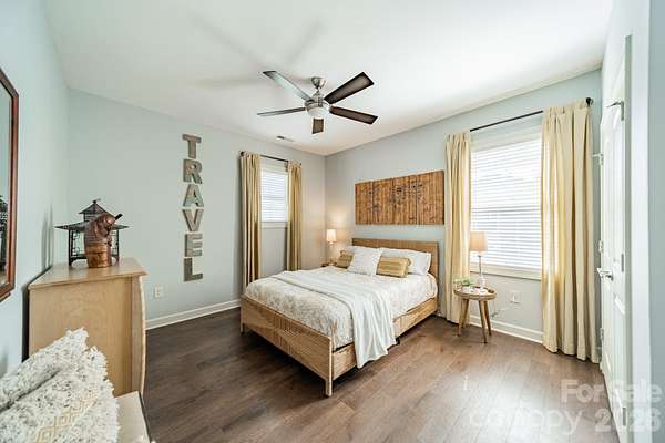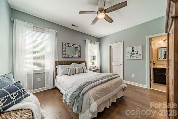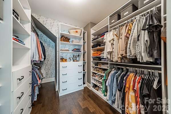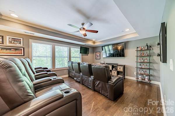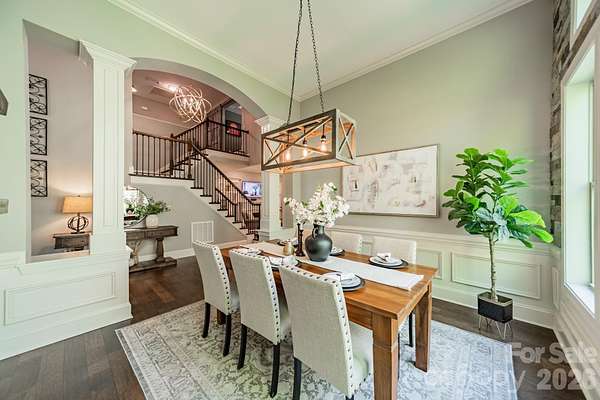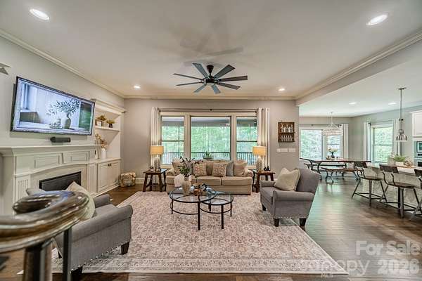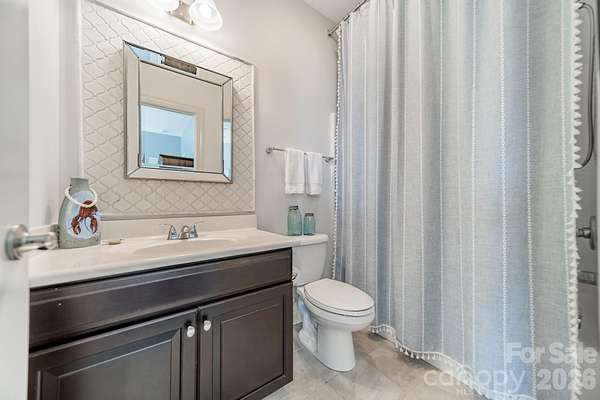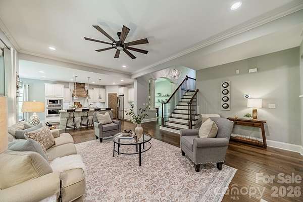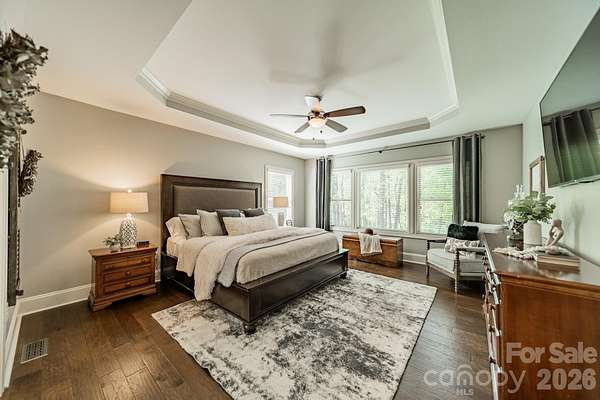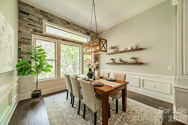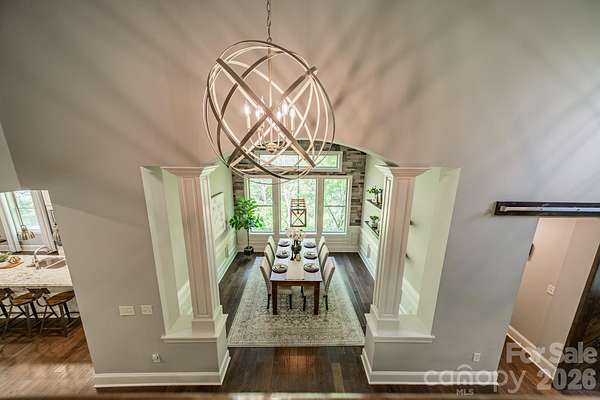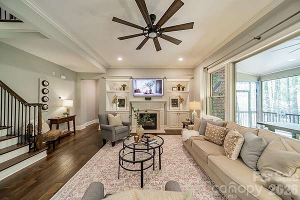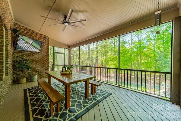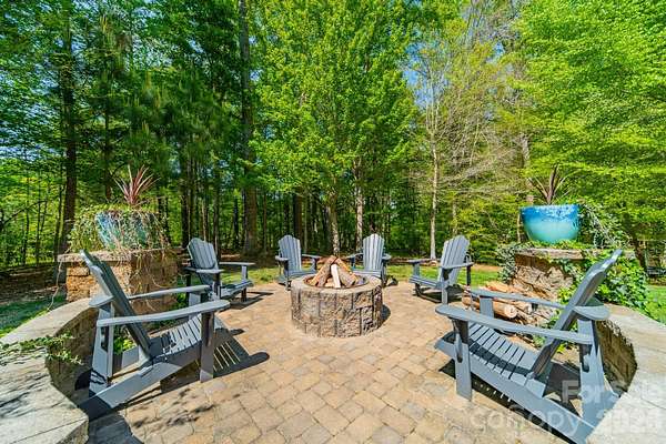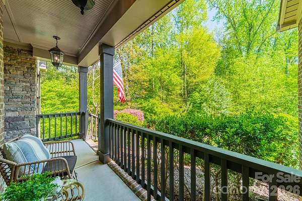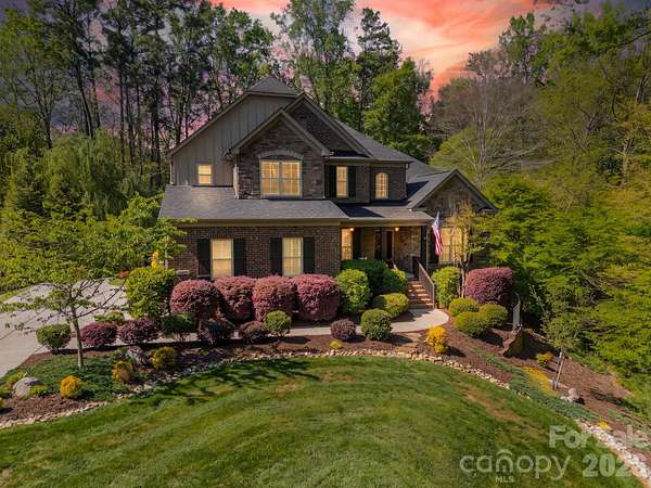 A rare offering in the sought-after boutique neighborhood of McKinley Forest, known for its expansive homesites, limited traffic, and exceptional lifestyle - just moments from parks, athletic fields, top-performing Weddington schools, and everyday conveniences. Perfectly positioned on one of the largest and most private wooded cul-de-sac lots in the neighborhood at 1.57 acres, this property delivers a sense of serenity and distinction from the moment you arrive. A sweeping approach gracefully unfolds to reveal striking architecture and captivating curb appeal, beautifully framed by mature hardwoods. The inviting front porch and impressive entry door welcome you into a grand two-story foyer with soaring ceilings and refined, custom details throughout. Handcrafted barn doors accent the study and media room adding both character and sophistication. The heart of the home is a true chef's kitchen, thoughtfully designed with a custom-stained wood hood, a statement stone-wrapped island, custom pantry door, and designer appointed finishes, all seamlessly open to the breakfast area and family room-creating an ideal flow for both everyday living and entertaining. Expansive windows fill the home with natural light while showcasing the picturesque, wooded surroundings. The dining room is equally impressive, featuring volume ceilings, a striking stone accent wall, and a beautiful grouping of windows that frame serene views of the surrounding hardwood trees. The main-level primary suite is a private retreat, complete with a spa-inspired bath, custom-tiled walls, and thoughtfully designed closet organization. Throughout the home, you'll find no carpet-only timeless, high-quality flooring. Secondary bathrooms are beautifully appointed with custom tiled feature accents, adding a refined and cohesive design element throughout the home. A beautifully designed staircase serves as a focal point, blending elegant craftsmanship with clean architectural lines as it gracefully connects the home's living spaces. The upper level offers a spacious media room and three additional bedrooms, including one with a charming sitting area and another featuring a private en-suite bath. Outdoor living is equally impressive. A screened-in porch overlooks the private backyard, where a paver patio and firepit create the perfect setting for gathering and relaxing. As evening falls, uplighting throughout the wooded backdrop casts a warm, ambient glow, enhancing the natural beauty and creating a truly magical atmosphere. A newer roof adds to the home's value, complementing the property's overall quality and care. Beautifully curated and impeccably maintained, this home offers luxury, privacy, and thoughtful design at every turn.