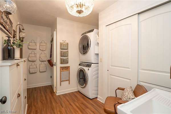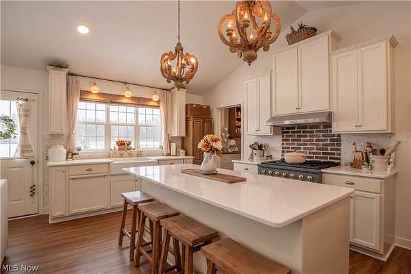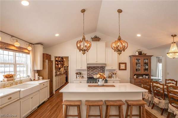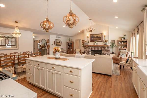 Modern English farmhouse charm meets peaceful country living on 5 private acres in Suffield Township. Completed in 2025 by Wayne Homes, this thoughtfully designed 3-4 bedroom, 2.5 bath home includes transferable builder warranties. Set back approximately 325 feet from the road, this property offers exceptional privacy and a true peaceful retreat. A welcoming front porch adds to its charm. Inside, soaring ceilings and wide-plank LVT flooring define the open-concept living space, anchored by a wood-burning brick fireplace. Expansive windows bring in natural light and showcase views of the surrounding acreage. Approximately 3.5 acres of the backyard are fully fenced, providing generous, usable outdoor space. The kitchen blends timeless character with modern function, featuring quartz countertops, a farmhouse sink, center island with bar seating, spacious 13 ft deep walk-in pantry, and a 36" Hallman dual-fuel range with gas cooktop and electric convection oven, and a Bosch 800 series custom panel dishwasher. The dining area flows seamlessly from the kitchen, ideal for everyday living & entertaining. The primary suite includes a spacious walk-in closet and en-suite bath with cultured marble vanity, linen storage, and tub/shower combination. Two additional bedrooms, along with a flex room, share a full bath. Main-level laundry provides convenient access to the garage, lower level, and foyer. The full basement includes an egress window and is plumbed for a full bath, with sink and commode already installed, offering excellent potential for future finished living space. This home boasts a RainSoft ozone and reverse osmosis system, water softener, CleanStart laundry system, and CleanSmart air filtration system, all with transferable warranties. Nearly new and full of upgrades, this home offers the space and privacy of country living with convenient access to nearby routes, combining modern comfort with classic country charm!