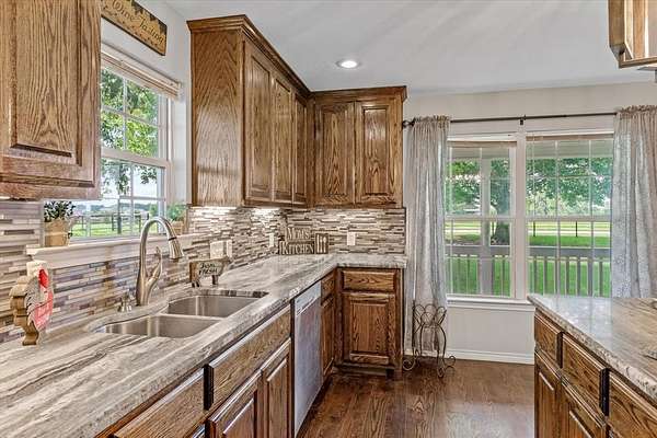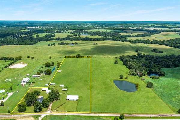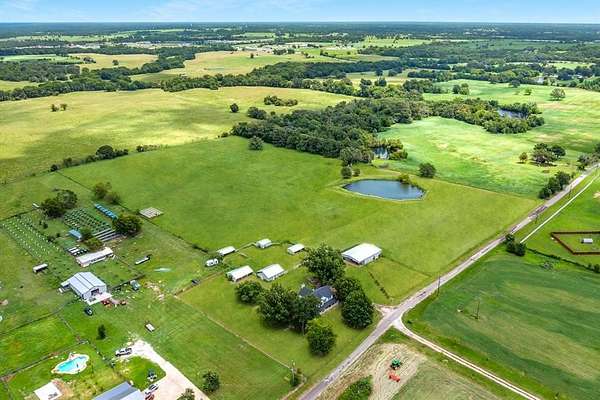 Step into your dream country retreat with this picture-perfect farmhouse set on 7 rolling acres straight out of a movie scene. Expansive wraparound porches welcome you to relax and soak in the peaceful surroundings. Inside, the oversized kitchen is designed for gathering, featuring granite countertops, custom real wood cabinetry, a large island with ample prep space, a peninsula for casual meals, and a formal dining area just steps away. The living room is a true showstopper with soaring two-story ceilings, hardwood floors, a cozy sitting nook, and a wood-burning fireplace framed by dramatic floor-to-ceiling windows. The main-floor primary suite offers a private escape with its own porch access and spa-like ensuite boasting granite counters, a soaking tub, walk-in shower, dual vanities, separate toilet room, and his-and-her closets. Upstairs, a versatile loft, second living area, or game room, three spacious bedrooms, and a full bath provide plenty of room for family and guests. The main-level laundry room is smartly placed with access from the kitchen, backyard, and half bath. For equestrian and hobby enthusiasts, the property features a 40x60 horse barn with five stalls, turnout pens, wash station, tack room, and even a barn kitchen. Additional improvements include two loafing sheds, chicken coop, storage building, and a storm shelter. Pipe fencing lines the front, with barbed wire securing the back and side for pets and livestock. All roofs were replaced in 2021, ensuring peace of mind. Located in Canton ISD and only an hour east of the DFW Metroplex, this one-of-a-kind property perfectly blends rustic charm with modern comfort. Being offered with 7 acres, with the option to purchase additional land if desired.