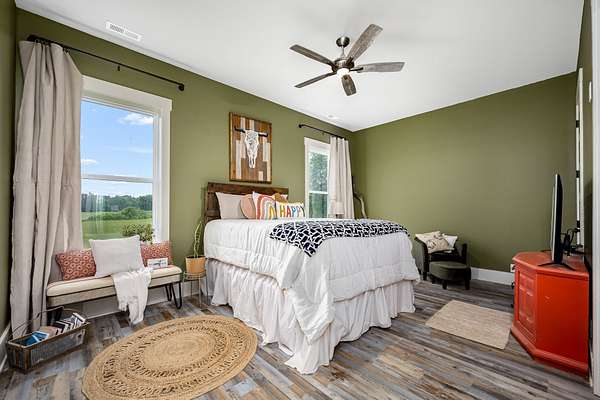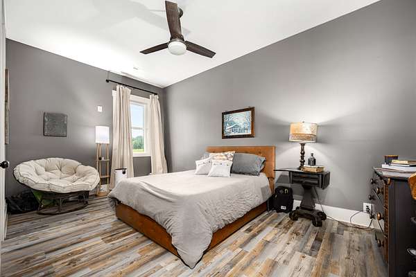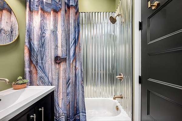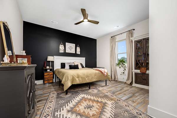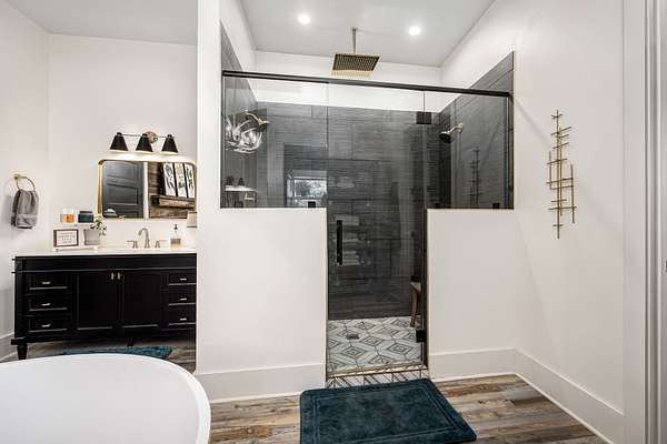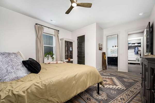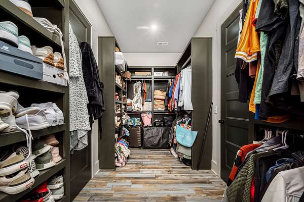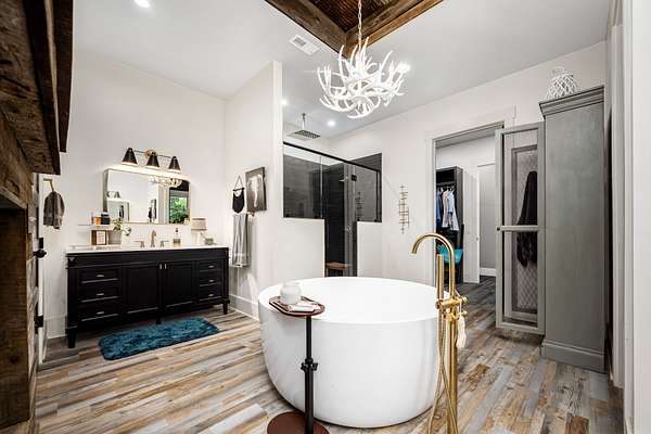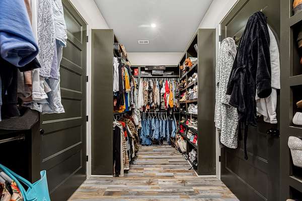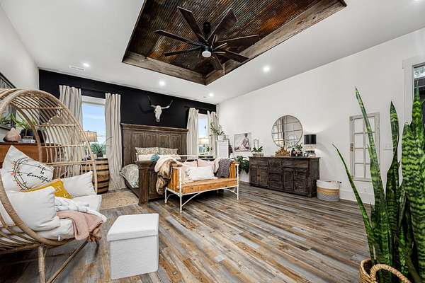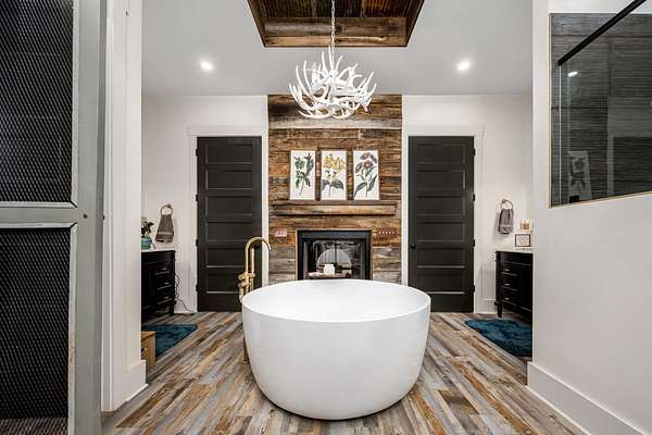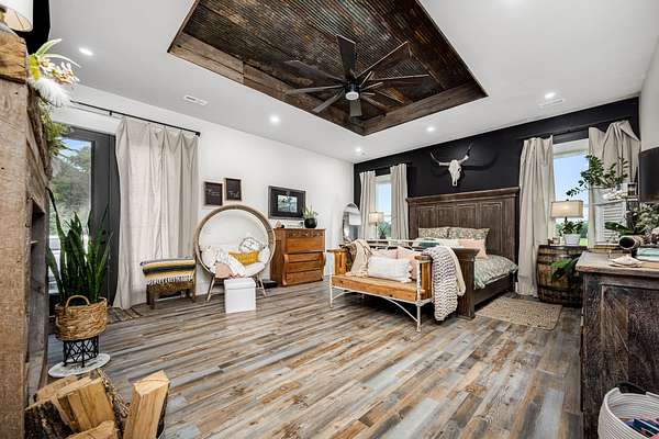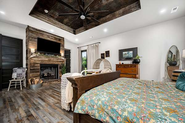 The stunning Primary Suite is a private retreat with trey ceilings, stylish tin accents, and a dual-sided fireplace shared with the spa-like bathroom. Unwind in the lavish 5x8 tile shower featuring double shower heads and a rainhead, or the round soaking tub with a freestanding faucet. A massive walk-in closet, dual vanities, and abundant natural light complete the luxury experience.