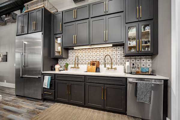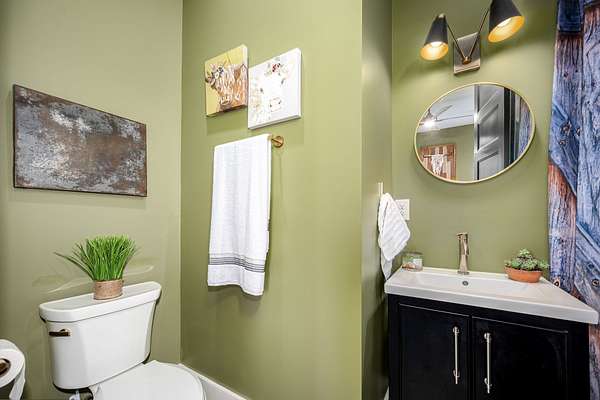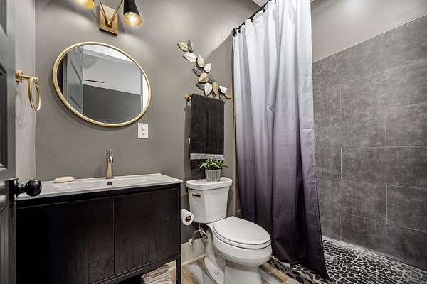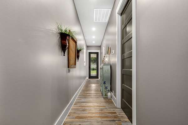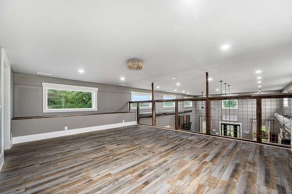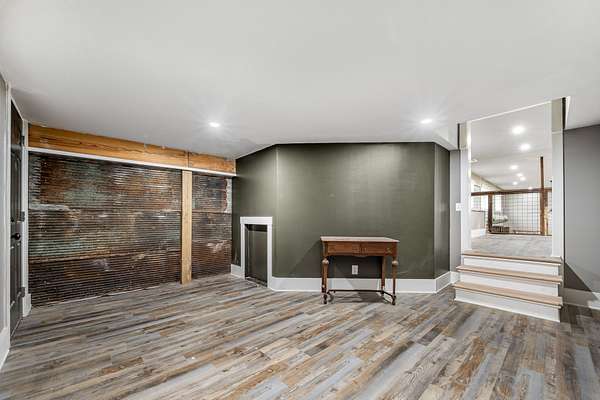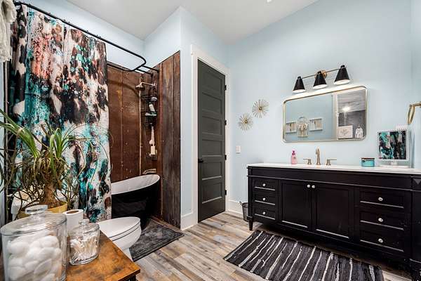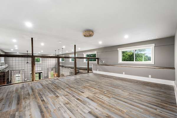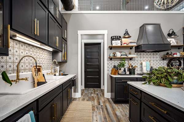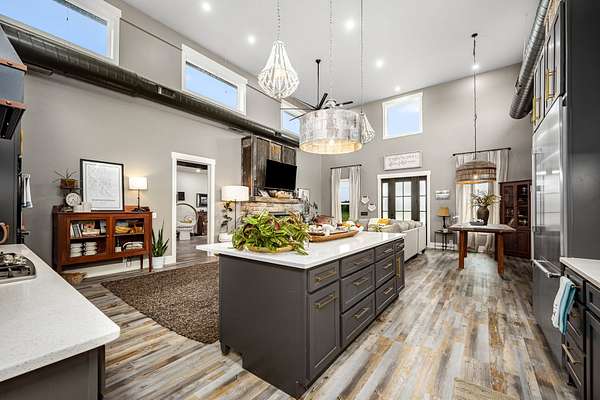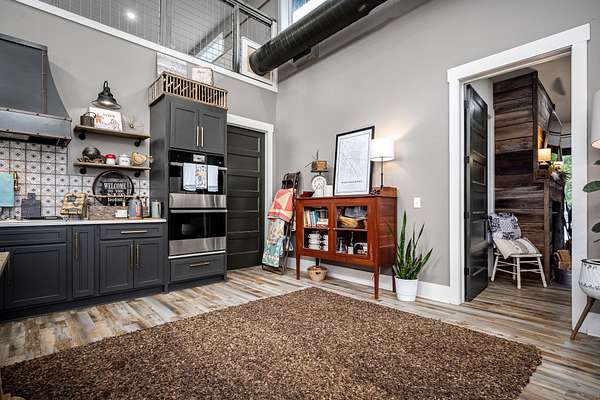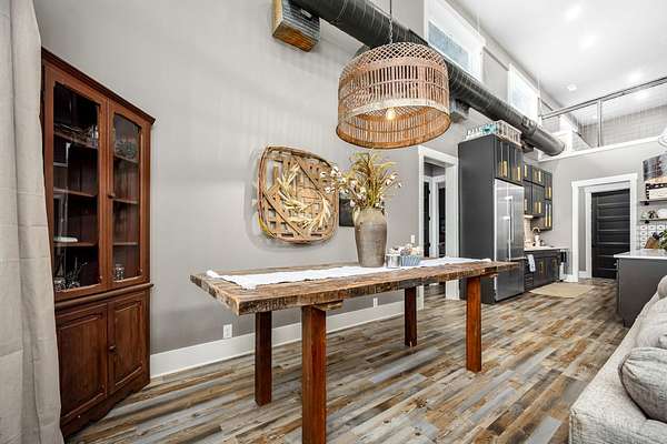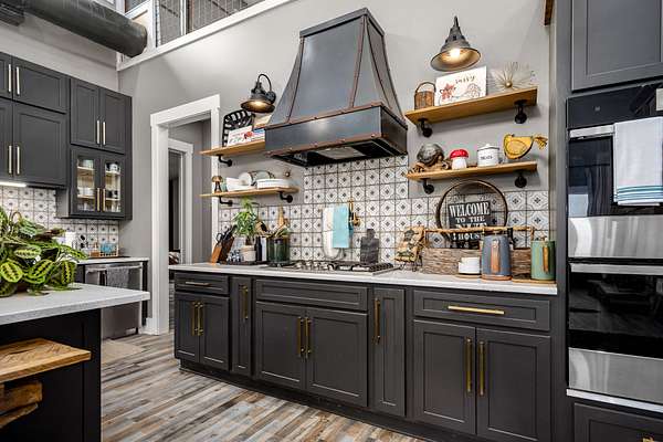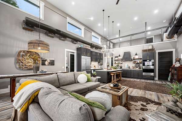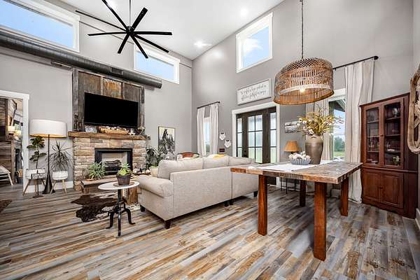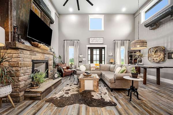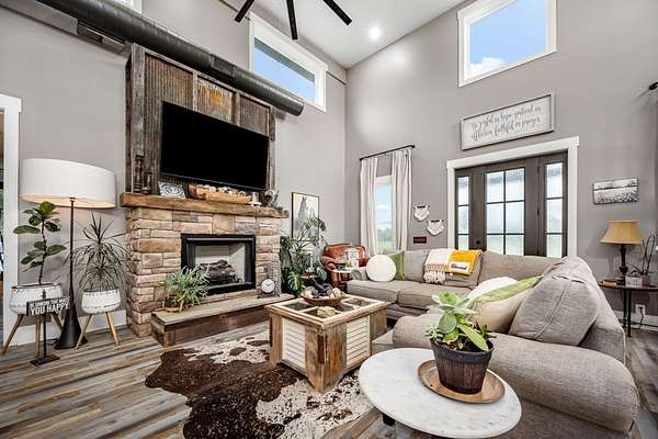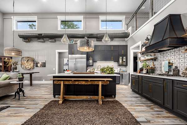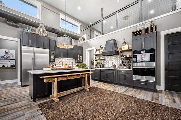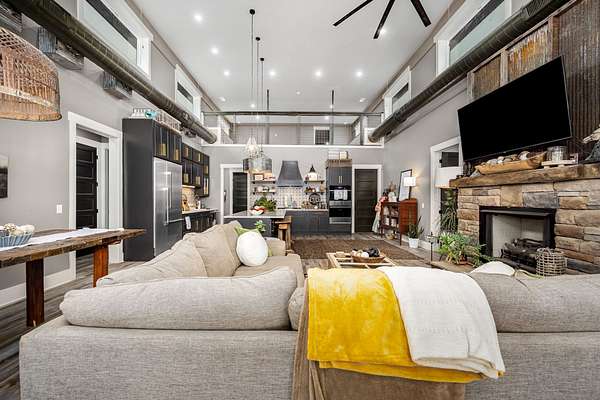 The heart of the home is the gourmet chef's kitchen, complete with quartz countertops, a 6-foot antique sink with double faucets, top-tier, high-end luxury appliances, a custom range hood, and endless custom touches. The open-concept living area is perfect for entertaining, showcasing exposed ductwork, a stone fireplace with gas logs, and durable yet elegant hardwood-style LVP flooring. Upstairs, a spacious media room loft offers the perfect retreat for movies or relaxation.