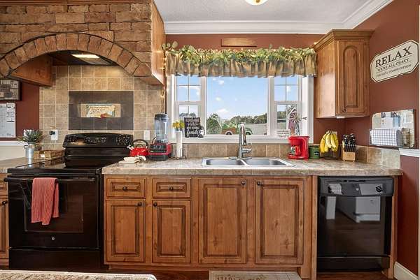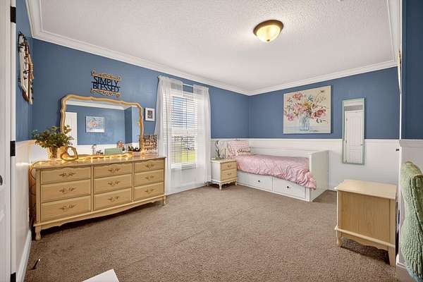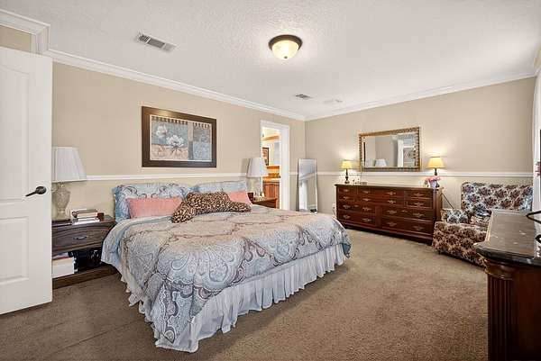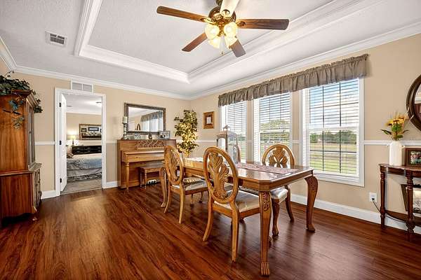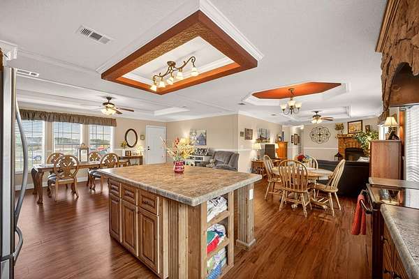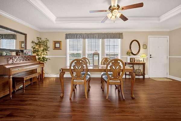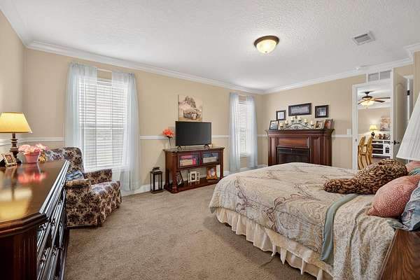 - Ceiling Fans(s), Crown Molding, Eat-In Kitchen, Kitchen/Family Room Combo, Open Floorplan, Primary Bedroom Main Floor, Split Bedroom, Thermostat, Tray Ceiling(s), Walk-In Closet(s), Window Treatments
