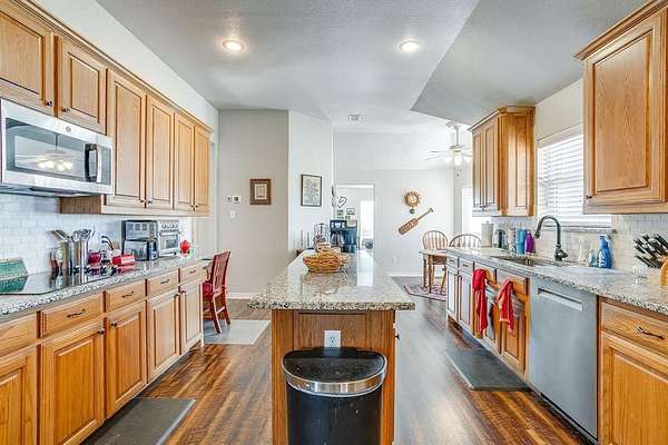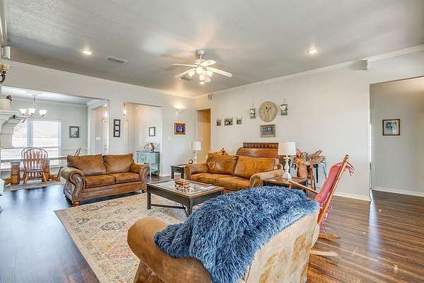 Beautiful single-story home situated on 2.828 acres in a sought-after gated equestrian community. This 4-bedroom, 2.5-bath residence offers 2,674 sq. ft. of thoughtfully designed living space with functional layout. The kitchen is a standout, featuring a large center island, granite countertops, custom cabinetry, and double ovens, ideal for everyday living and entertaining. The living room is warm and inviting with a gas fireplace. The spacious primary suite includes a luxurious bathroom with a jetted garden tub, separate shower, dual sinks, and individual vanities. Designed for equestrian enthusiasts, the property includes a large barn with two stalls and separate electric meter. Pasture area has round pen, and full horse fencing. Enjoy access to multiple riding trails and a lighted community arena. Located outside city limits, offering privacy and room to roam while still within an established equestrian neighborhood.