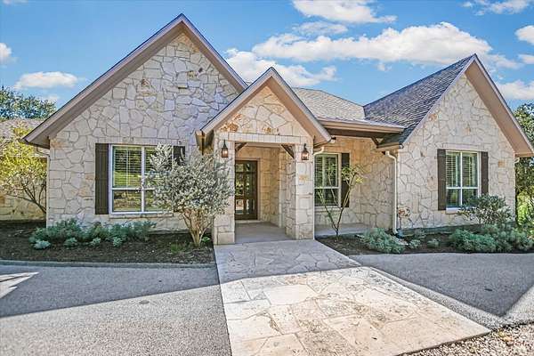Beautiful single-story custom home, built in 2014, nestled among mature live oak trees on over six acres of fully usable land in the highly sought-after gated community of Stone Mountain. Just under 3,000 square feet of well-designed living space. This 3-bedroom, 3.5-bathroom home also includes a dedicated office with custom built-ins, rich hardwood and tile flooring throughout (no carpet), and abundant natural light. The gourmet kitchen features Viking and Bosch appliances, granite countertops, a prep sink, built-in gas range and cooktop, and a huge walk-in pantry. A spacious formal dining room sits just off the kitchen, and a charming breakfast nook opens to the back covered patio. Step outside to your own private retreat. The covered patio includes a built-in outdoor kitchen overlooking a heated in-ground pool and spa, all set against panoramic, unobstructed views of Backbone Mountain. The split floor plan provides privacy and comfort. Two large guest bedrooms each have walk-in closets; one features an ensuite bath, while the other shares a full hallway bath. A long pass-through closet offers extra storage and organization space. The primary suite is tucked away for privacy and offers stunning views and generous natural light. The ADA-compliant primary bath features a large roll-in shower, zero-transition entry, and grab bars throughout. Every inch of this property is usable, offering the perfect combination of wide-open space and breathtaking scenery. Hill Country serenity with convenient access!