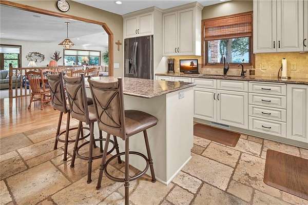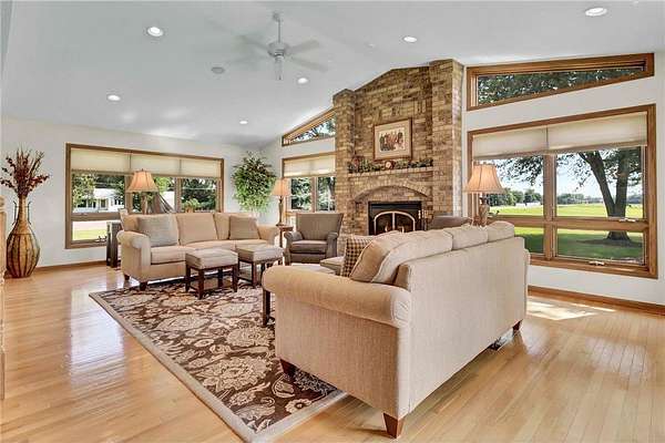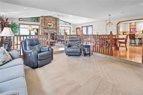 Step inside to find a home in excellent condition, featuring an updated kitchen with a center island, custom cabinetry, stunning Cambria countertops, and a stylish backsplash. The main floor also offers a convenient main level laundry room, a cozy sunken living room, and a spacious great room with vaulted ceilings, gorgeous brick fireplace and large daylight windows that flood the space with natural light. Hardwood floors on the main level add warmth and timeless appeal.