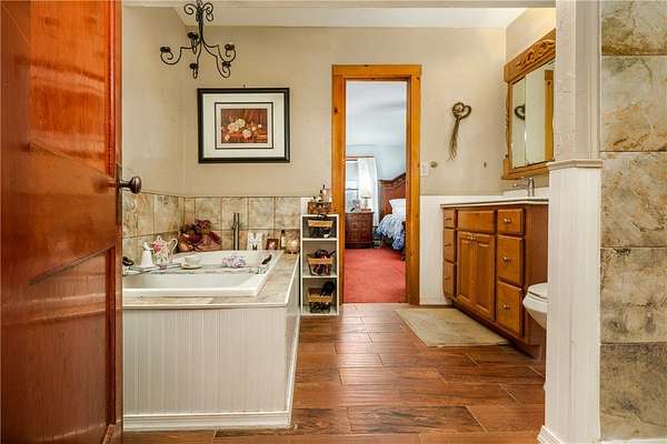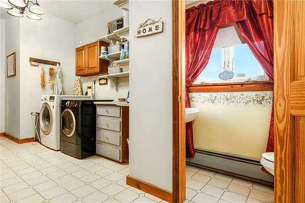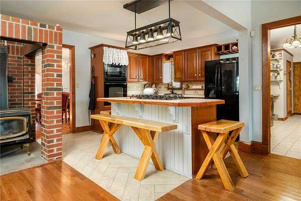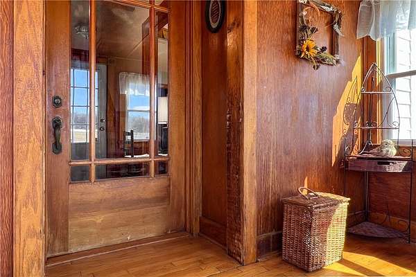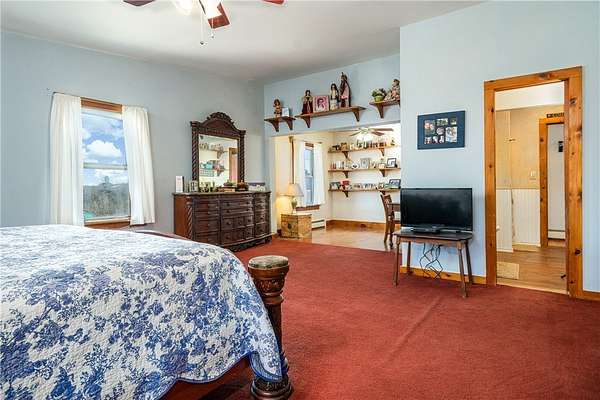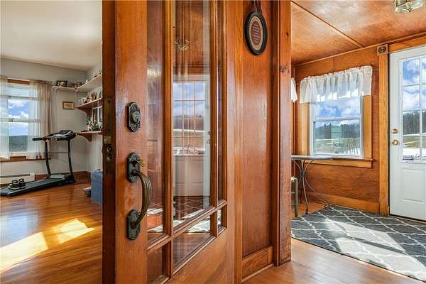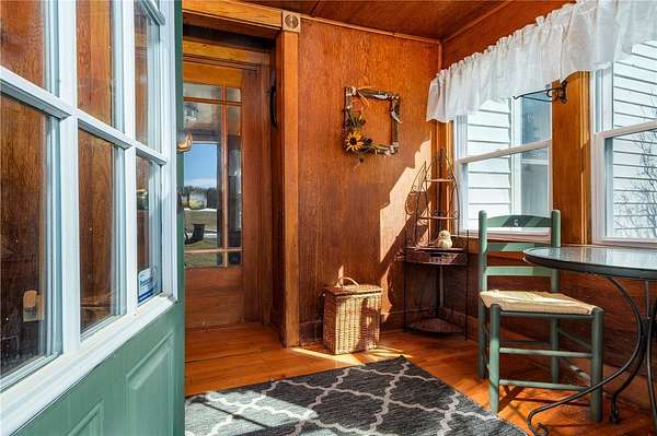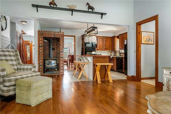 Perched atop a scenic ridge, this well-appointed contemporary farmhouse offers mountain views across open cornfields and pastoral countryside. 3 signature dormers define its charming character, while a private rural setting delivers true tranquility - all just minutes from town. The 1930s property is thoughtfully laid out across two floors, with warm wood flooring, trim, and doors throughout the main living areas and a cohesive, understated palette that lends every room a calm, contemporary feel. A convenient mudroom connects seamlessly from an oversized insulated 2-car garage and serves as a well-organized transition space complete with a half bath, laundry, folding shelf, and storage closets. A guest bedroom sits just off this wing. The heart of the home is an open great room where living and kitchen flow naturally together. A glass slider opens onto a large wood deck - the ideal vantage point for the view of the pond, barn, and surrounding landscape. The kitchen features solid Wood Mode cabinetry, a 5-burner gas range, wall oven, and full suite of appliances. An Avalon wood-burning stove in a striking floor-to-ceiling brick surround anchors the space with warmth and architectural character. The main-floor primary bedroom offers 3 large windows, 2 closets, and a hardwood-floored office alcove. The adjacent full bath includes a jetted soaking tub and standing shower. Upstairs, beneath the dormers, are 3 additional rooms served by a full central bath. The home features a dual-fuel hydronic heating system that combines a wood and an oil furnace for efficient, flexible comfort. Both heat water that circulates throughout the house, with the oil burner automatically taking over when the wood fire slows down, reducing oil use and fuel costs. The system can also supply domestic hot water, complemented by a separate electric water heater for added convenience and reliability. Outside, 30+ acres include a large metal barn with poured concrete floor and full electricity, chicken and duck coops, an above-ground pool with deck, and a quarter-acre pond that frames the view beautifully from the main living areas. Homes of this character and setting are genuinely rare.