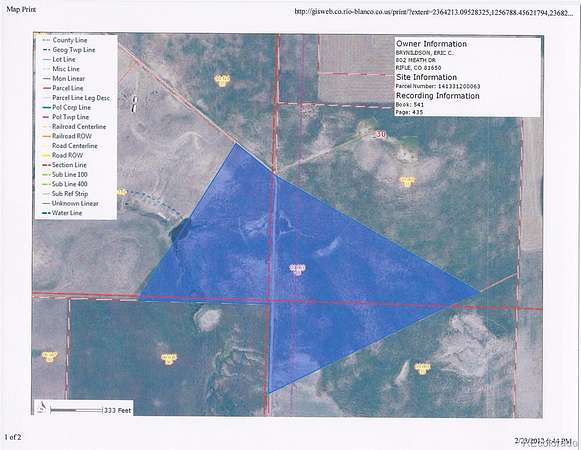 Little Beaver Estates borders the Oak Ridge State Wildlife Area, some of the best elk and deer hunting in northwest Colorado. Eight miles east of Meeker off of County Road 6. Twenty one 35 acre parcels of rolling hills which are currently farm land. The developer built a private road through the estates providing access to the lots on either side of the road. The road ends at the south side of the development where it borders the Colorado Division of Wildlife's - 6,000 acre Oak Ridge Wildlife Area, where there is very good Elk, Pronghorn, and Mule Deer hunting, accessed by foot or horseback only. A common area along the south side of Lots 15 and 16 provides an unloading area where only the owners of the Little Beaver Estates can park, overlook and access the State land. Electricity and telephone land lines have been buried along the road, providing these utilities for each lot. For domestic water the buyer will need to have a well drilled, or put in a cistern and haul water from Meeker, which most of the owners do because the well water is high in sulfates, nitrates and minerals and will need to be cleaned up with a reverse osmosis system to be potable. A septic system will need to be installed for domestic sewage on each parcel. This parcel has a few ponds on it, which in normal years have water in them for stock watering.