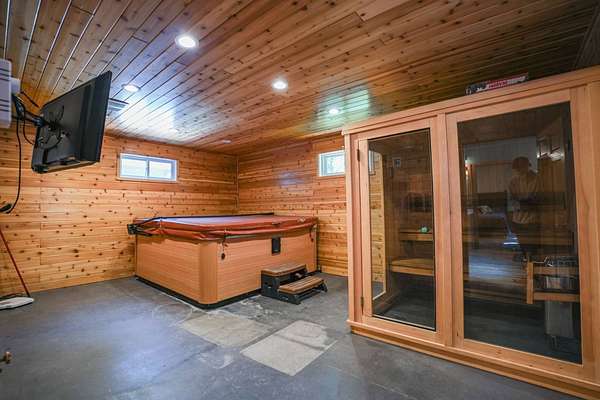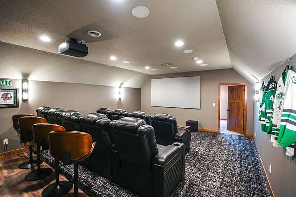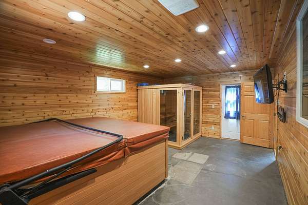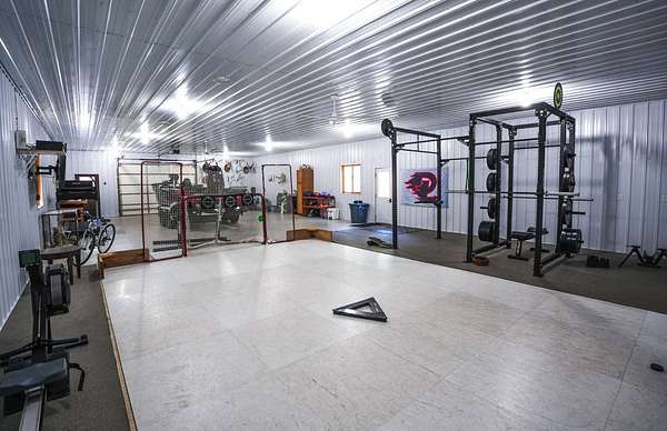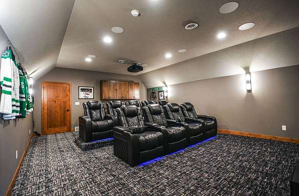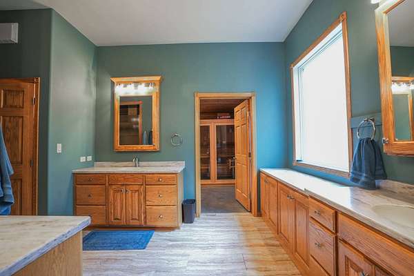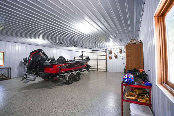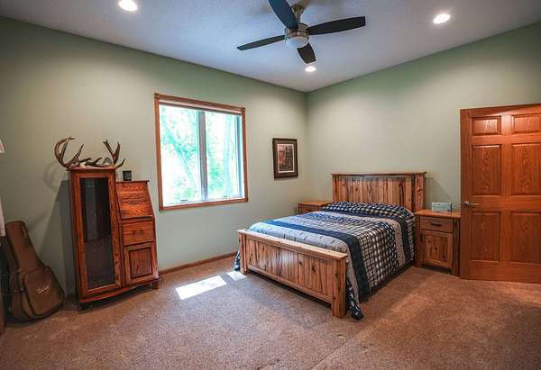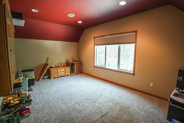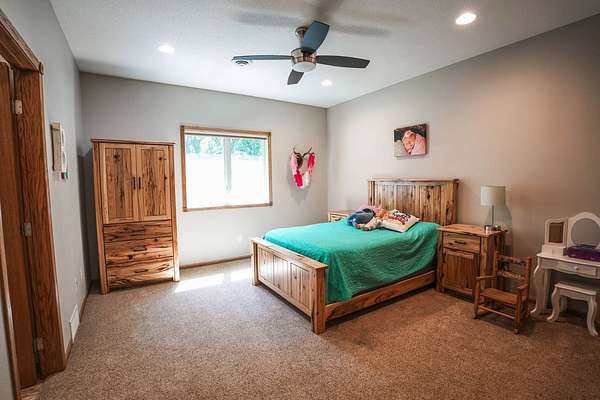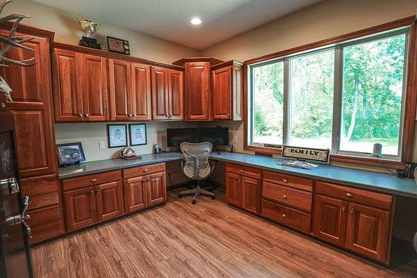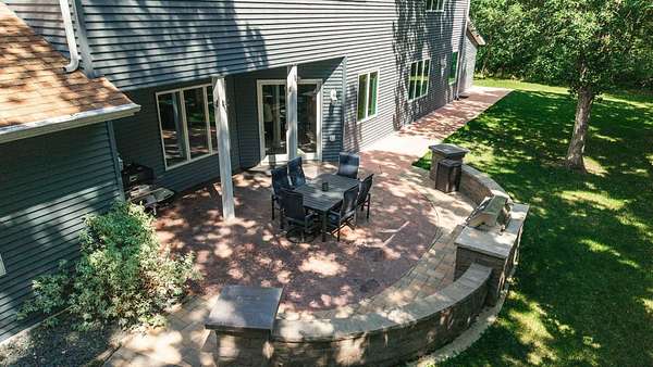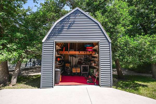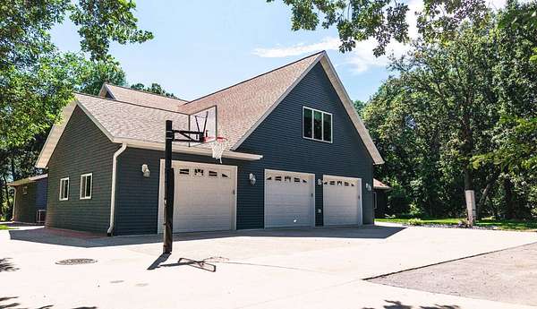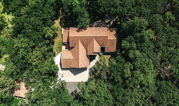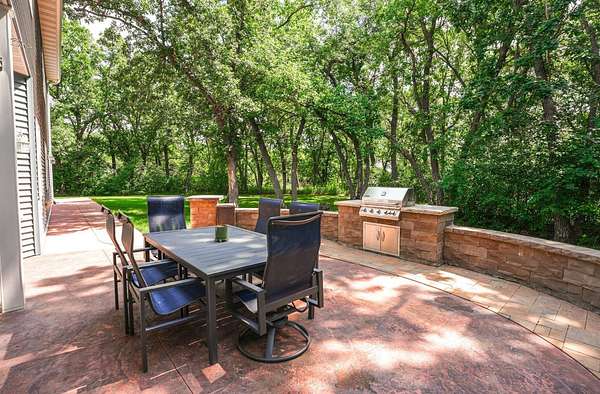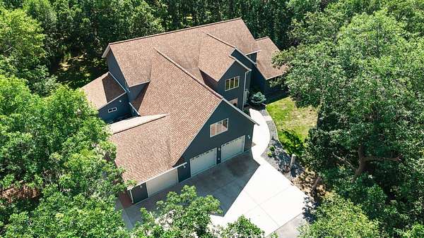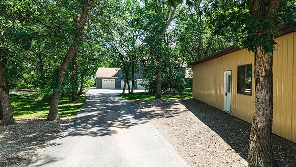 Custom Home in a Serene Natural Setting! Discover your dream home nestled in a picturesque treed acreage, offering a perfect blend of luxury and tranquility. This expansive 6,396 sq. ft. slab-on-grade residence features dual heating systems, including floor heat and forced air/central air, ensuring comfort year-round. The home boasts 5 spacious bedrooms and 4.5 baths, with impressive 10' ceilings on the main floor and 9' ceilings upstairs. The gourmet kitchen is a chef's delight, complemented by a formal dining area and a luxurious master en-suite. Enjoy relaxation in the hot tub and sauna room addition, or work from home in the elegantly appointed office with cherry cabinets. Convenience is key with a main floor laundry and a guest bedroom complete with an en-suite bath. Upstairs, you'll find a large recreation room, three additional bedrooms-one featuring a Jack and Jill bath and another with its own private bath. Entertainment is taken to the next level in the media room, where the equipment with surround sound, projector, screen, and new theater seating are not included at the price but are negotiable. The attached 3-car garage is fully finished, featuring floor heat and floor drains for added practicality. Step outside to enjoy the stamped patio, complete with a grill plumbed to natural gas and a cozy firepit, perfect for gatherings. For hobbyists and enthusiasts, the 28'x32' detached garage, known as the "Man Cave," is finished and heated with a floor drain, while the 32'x64' shop offers a wood frame, metal exterior, 12' side walls, and a heated, finished interior with epoxy flooring. Additional storage options include a 16'x32' military shed with a dirt floor and a 12'x16' yard shed with a loft. The property features a blacktop driveway and beautifully landscaped surroundings, all set within a serene wooded setting. This custom home is a true sanctuary, combining modern amenities with the beauty of nature.