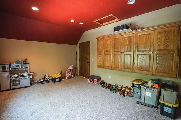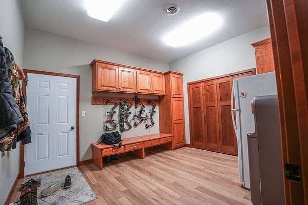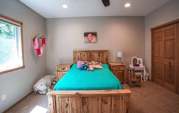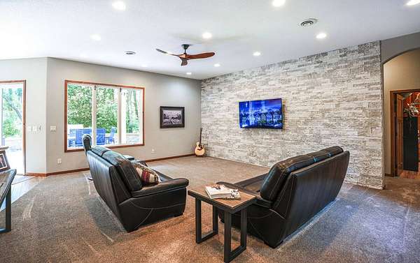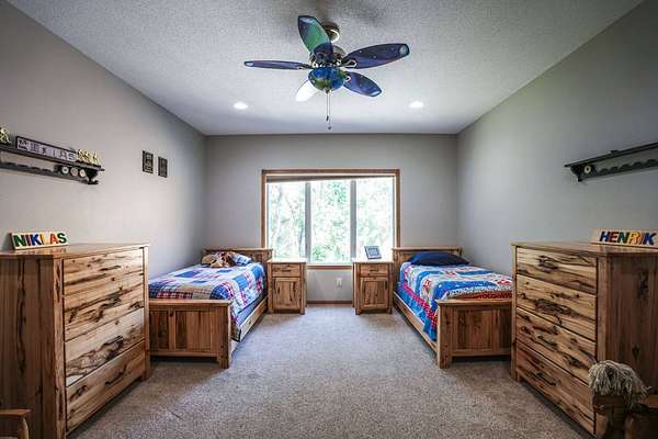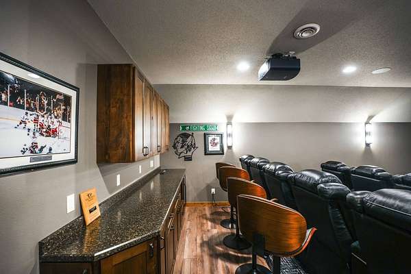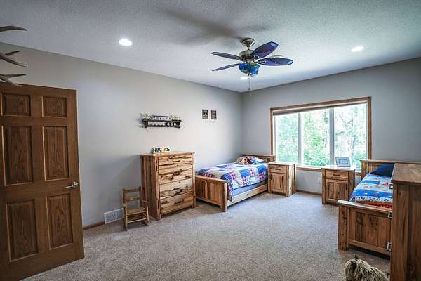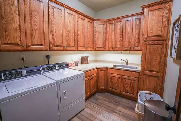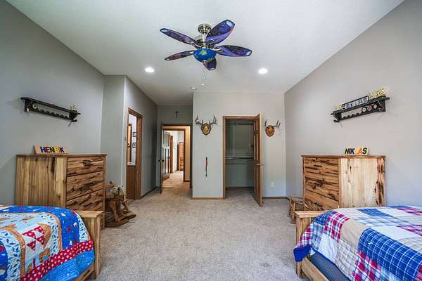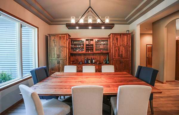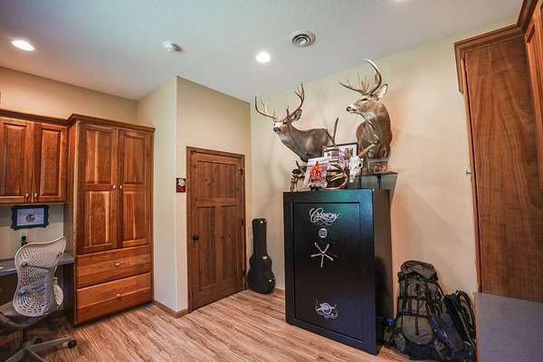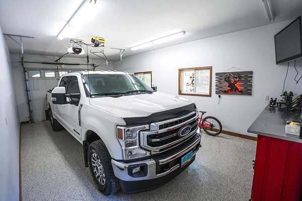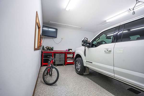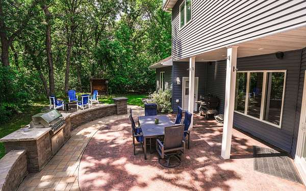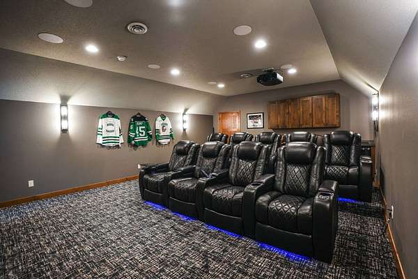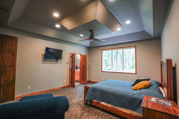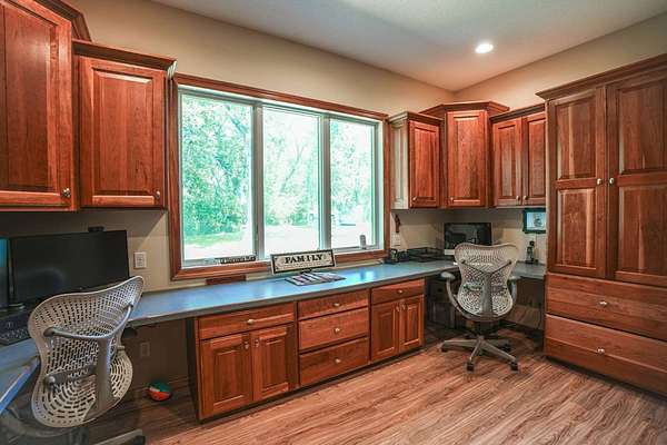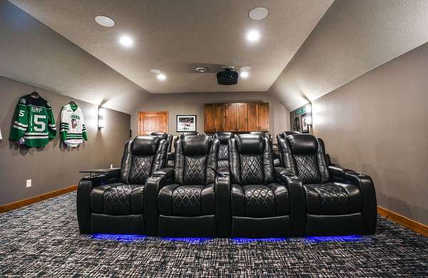 Custom Home in a Serene Natural Setting! Discover your dream home nestled in a picturesque treed acreage, offering a perfect blend of luxury and tranquility. This expansive 6,396 sq. ft. slab-on-grade residence features dual heating systems, including floor heat and forced air/central air, ensuring comfort year-round. The home boasts 5 spacious bedrooms and 4.5 baths, with impressive 10' ceilings on the main floor and 9' ceilings upstairs. The gourmet kitchen is a chef's delight, complemented by a formal dining area and a luxurious master en-suite. Enjoy relaxation in the hot tub and sauna room addition, or work from home in the elegantly appointed office with cherry cabinets. Convenience is key with a main floor laundry and a guest bedroom complete with an en-suite bath. Upstairs, you'll find a large recreation room, three additional bedrooms-one featuring a Jack and Jill bath and another with its own private bath. Entertainment is taken to the next level in the media room, where the equipment with surround sound, projector, screen, and new theater seating are not included at the price but are negotiable. The attached 3-car garage is fully finished, featuring floor heat and floor drains for added practicality. Step outside to enjoy the stamped patio, complete with a grill plumbed to natural gas and a cozy firepit, perfect for gatherings. For hobbyists and enthusiasts, the 28'x32' detached garage, known as the "Man Cave," is finished and heated with a floor drain, while the 32'x64' shop offers a wood frame, metal exterior, 12' side walls, and a heated, finished interior with epoxy flooring. Additional storage options include a 16'x32' military shed with a dirt floor and a 12'x16' yard shed with a loft. The property features a blacktop driveway and beautifully landscaped surroundings, all set within a serene wooded setting. This custom home is a true sanctuary, combining modern amenities with the beauty of nature.