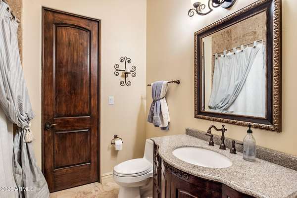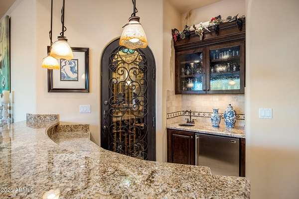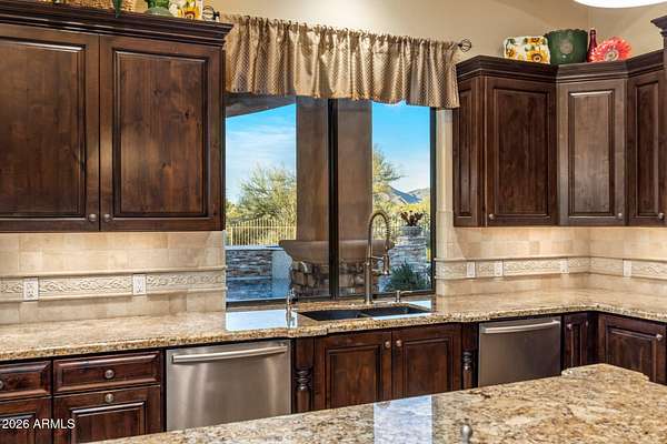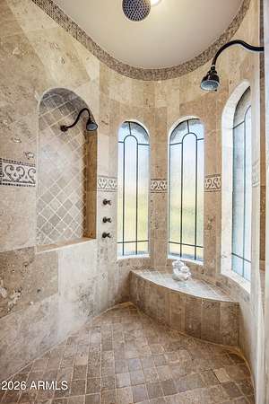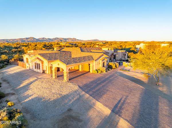 Set on 4.3 private acres in a premier location, this gated estate offers exceptional privacy w/sweeping desert & mountain views. A gated entry and pavered drive lead to a four car garage and fenced courtyard. Inside, soaring 14' ceilings frame a well designed split floor plan with refined architectural details and clear pride of ownership. The home features five bedrooms, five full baths, two half baths, an office, theater room, wet bar, and wine cellar. The kitchen is equipped with high end appliances and an oversized island ideal for entertaining. Expansive glass sliders open to a covered patio with fireplace, pool, and spa. Enjoy Arizona sunrises and sunsets from the rooftop deck. Located in the horse friendly Pinnacle Peak Ranchos community with room to add equestrian amenities.