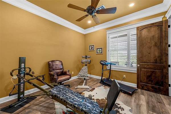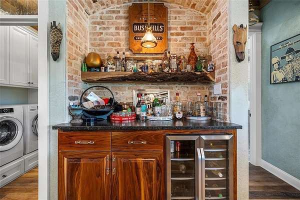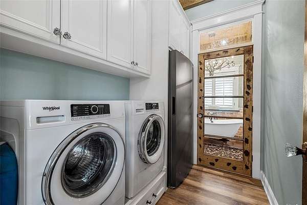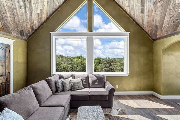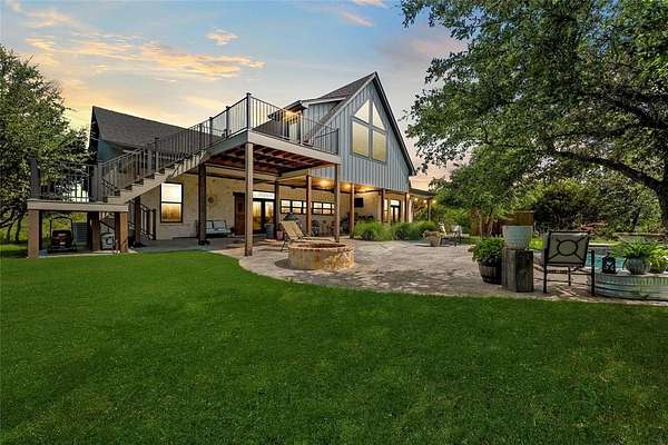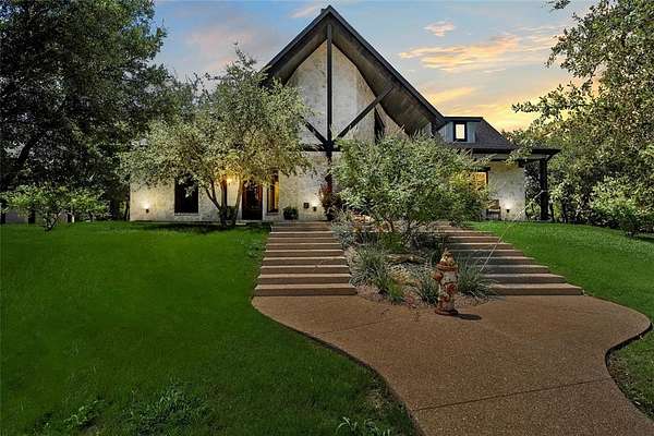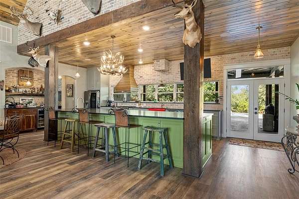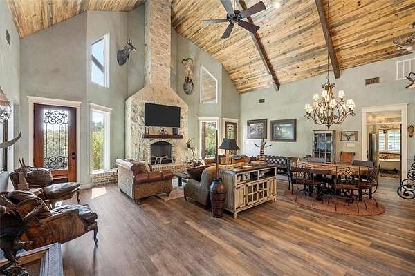 Discover your dream modern rustic home, a true sanctuary tucked away in a private setting surrounded by stunning trees and a genuine piece of paradise. Crafted by a master craftsman, this residence showcases exquisite details, including elegant laminate wood plank flooring and luxurious leathered granite countertops. The stained diagonal tongue-and-groove ceilings add warmth and character throughout the home. The heart of the home boasts a remarkable 20 foot breakfast island, complemented by custom-built cabinets that provide ample storage and style. Entertain in the family room, which features a striking 20+ foot fireplace, designed for both wood burning and gas logs, and enjoy the convenience of a wet bar. The gourmet kitchen is equipped with a gas range and a wine fridge, while the faux-finished walls add a touch of artistic flair. Retreat to the private master suite, complete with its own entrance and breathtaking views of the serene outdoor setting, including an in-ground pool with an enchanting water feature. The master bath is a sanctuary, featuring his and her vanities, a spacious walk-in shower, a soaking tub, a bidet, and an impressive walk-in closet with built-in organization. Convenience is paramount with two laundry rooms, ensuring that daily chores are a breeze. Upstairs, discover a unique private suite with doors that overlook the family room, perfect for a second living area, office, bedroom, or game room. This versatile space includes a wet bar, a full bathroom, and a deck that offers picturesque views of the lush, treed property and pool. Step outside to enjoy the covered patio that overlooks the sparkling pool or take a refreshing break in your very own private sauna. The garage adds even more value with a guest suite complete with two bedrooms, a full bathroom, and a small kitchenette. This remarkable home truly offers everything you could desire a private, tucked away, yet conveniently close to all that Waco has to offer.
