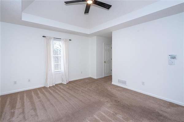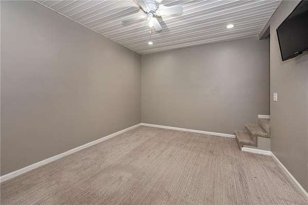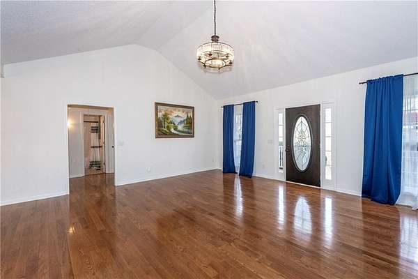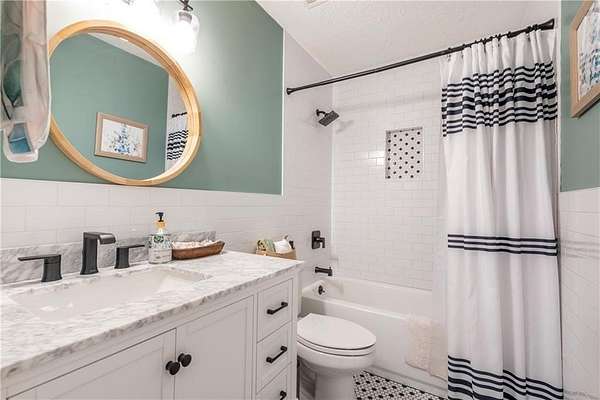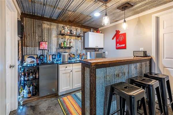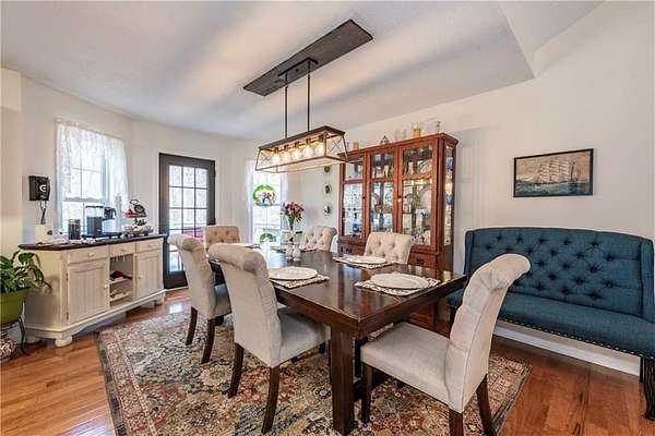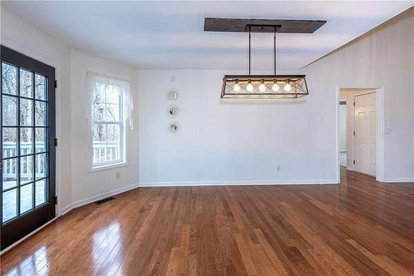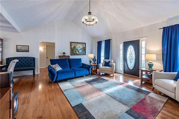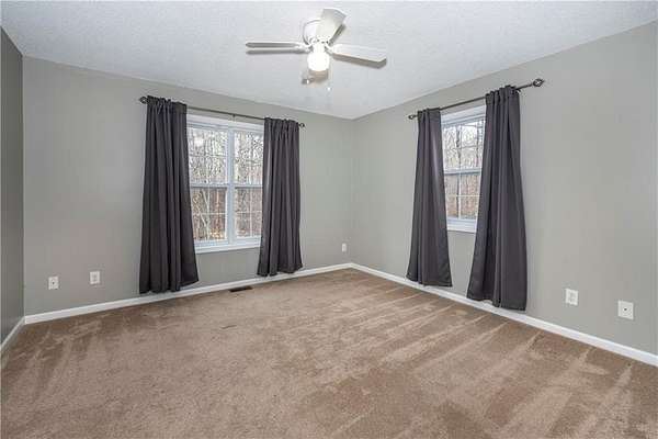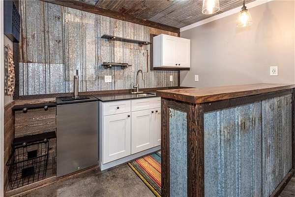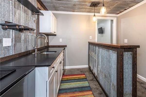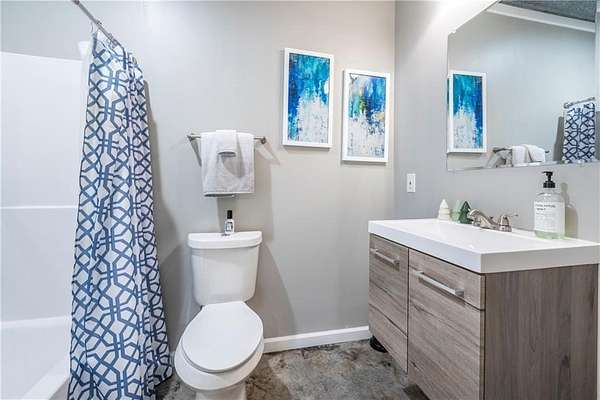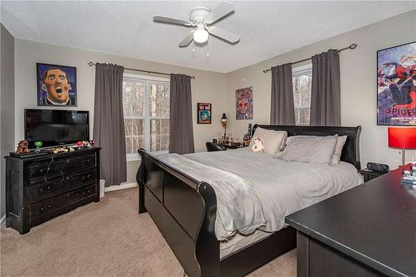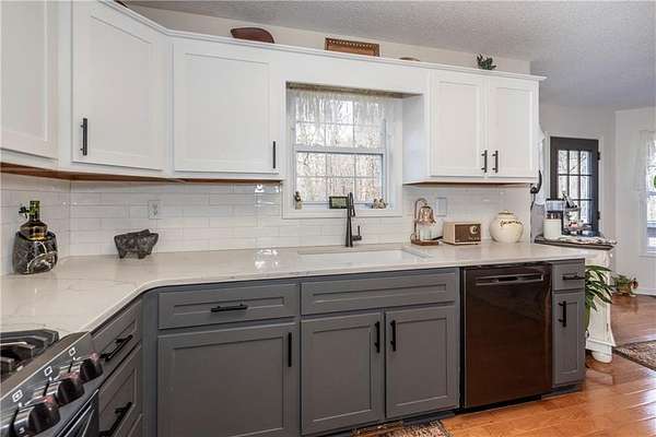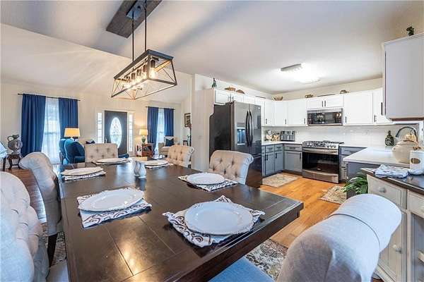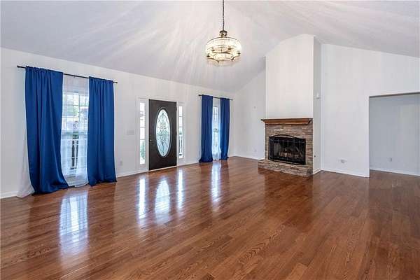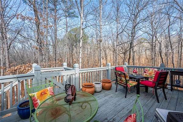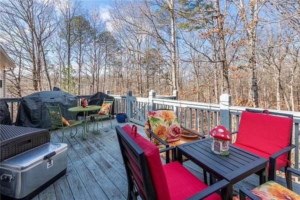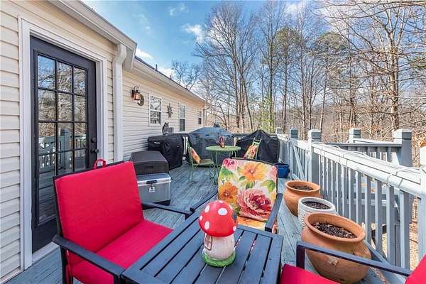 Situated on one of the largest lots in the neighborhood at 1.55 acres, this home offers unparalleled privacy, backing up to a wooded property. It boasts a fully fenced backyard. This 3/4-bedroom, 3-bathroom home features modern updates and a finished basement. For guests, the cul-de-sac offers convenient parking, leading to wide, easy stone steps directly to the front door. The main floor is designed for comfortable living, featuring a split bedroom plan with three bedrooms and two bathrooms. Step inside to discover an open, bright living room with a vaulted ceiling and a stone fireplace with gas starter. Newer real wood flooring flows throughout the living area, kitchen, and dining spaces. The renovated kitchen boasts beautiful painted cabinetry, stone countertops, and updated stainless steel appliances that remain. Also on the main level, two generously sized guest rooms and a renovated full bath provide additional living space; the spacious primary suite features a trey ceiling, two closets, and an attached bath with double vanities, a soaking tub, and a separate shower.Descend to the lower level to find an office with a closet that opens either to the garage or to a large room with an atteched full bath. This versatile space can be used as an in-law suite, an efficiency apartment, or as a media room/second living room, complete with a fun and funky built-in bar, refrigerator, sink, and even a keg cooler. A great space for entertaining and family enjoyment. Dont miss the tin ceiling and accents that add a fun and whimsical touch to this space. From this area, you can exit to the private covered patio, where you can enjoy your fenced yard with your furry friends, kids, or simply relax and enjoy nature. The two car garage can also fit another vehicle in the back of one bay or use that large area for storage.Located in the vibrant Fieldstone community, residents have easy access to a range of neighborhood amenities, including two swimming pools, tennis/pickleball courts, and a playground. Shopping, dining, and top Cherokee County schools are all just minutes away. This home offers the perfect blend of comfort, outdoor space, and community living in one of Cantons most popular neighborhoods. Square footage of the finished basement should be confirmed by buyer and has been estimated from the floor plan. Septic system permitted for 3 bedrooms.
