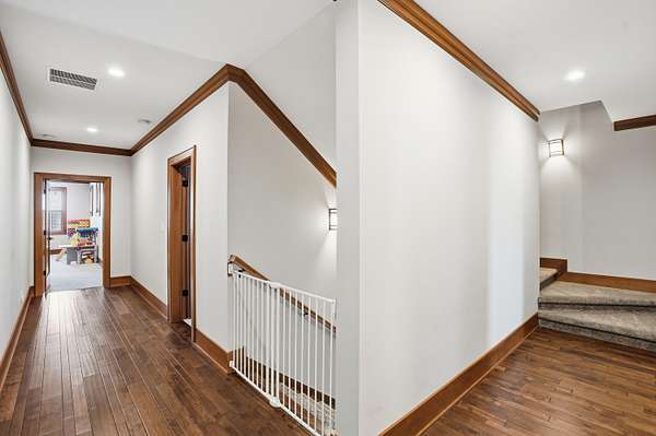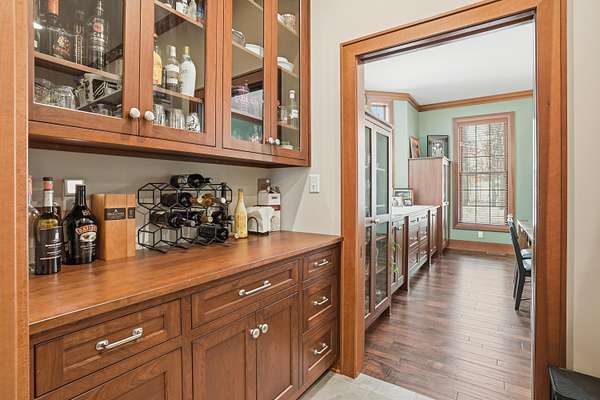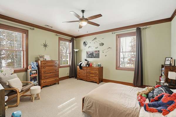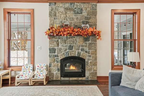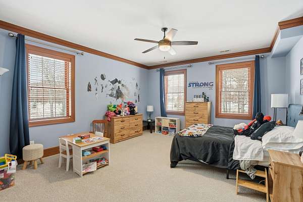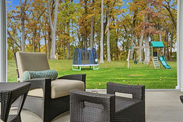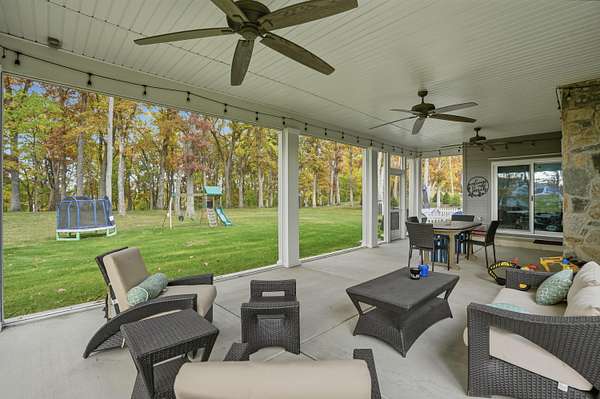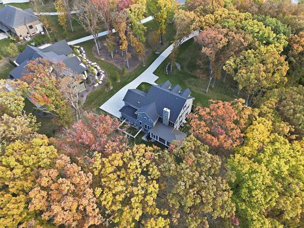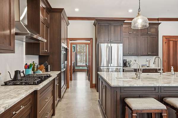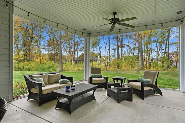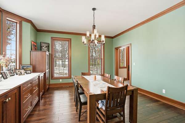 Discover luxury living in this custom-built 3-story home, perfectly nestled on a premium 2.61-acre wooded lot in highly desirable Ellendale Farm. Designed to impress, the main level features 10-ft ceilings, rich hardwood flooring, and a warm family room with a wood-burning fireplace. Stunning crown molding found throughout 1st and 2nd levels. Host unforgettable gatherings in the elegant formal dining room, enhanced with beautiful custom cherry wood built-ins and a convenient butler's pantry. The gourmet kitchen is a chef's dream, showcasing Amish-crafted maple cabinetry, an enormous center island with two sinks, Bosch appliances, double oven, and a walk-in pantry. With 7 bedrooms and 4 baths, this home offers incredible flexibility, including a main-level guest bedroom with adjacent 3/4 bath. On the second floor, the luxurious primary suite awaits--complete with a spa-inspired bathroom and a massive walk-in closet. Two additional spacious bedrooms offer comfort and privacy. The third level features two more bedrooms and a full bath, ideal for guest quarters, teens, or multigenerational living. Relax outdoors on the oversized screened-in porch overlooking peaceful wooded views. The unfinished basement with 10-ft pour, 2 Egress windows and rough-in for a future bath provides endless potential for expansion. A rare blend of elegance, craftsmanship, and natural beauty--this is the home you've been waiting for. Additional amenities: Shutters Are Solid (Atlantic Premium Shutters) LP Siding (Diamond Kote longer lasting line from LP), Chimney Chase is true stone , Natural Gas Hook Up For Grill, Field Tile Daylights , ATT Fiber or Comcast Xfinity Available, Ring Cameras Hard Wired & Electric Outlets At Soffits. 3 Car garage is EV capable.