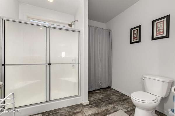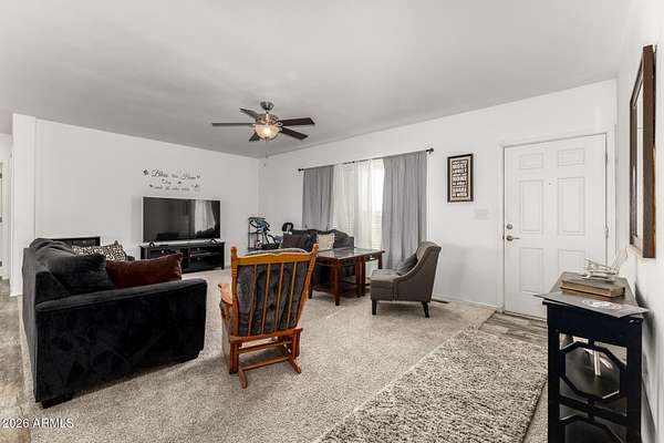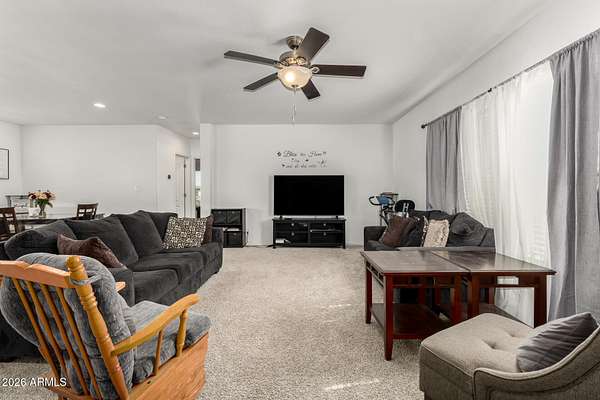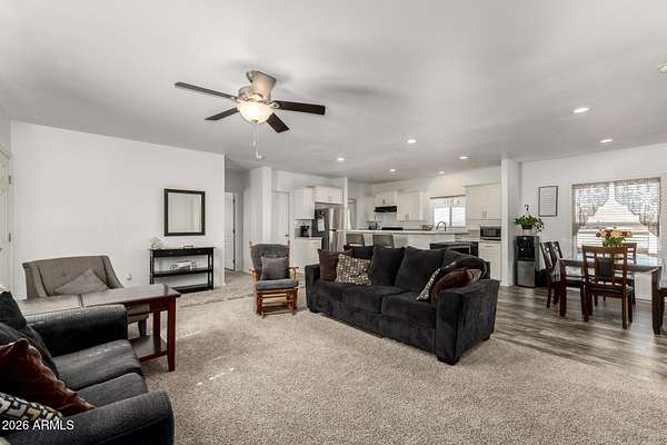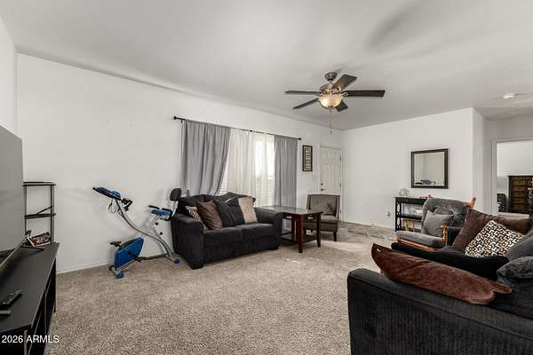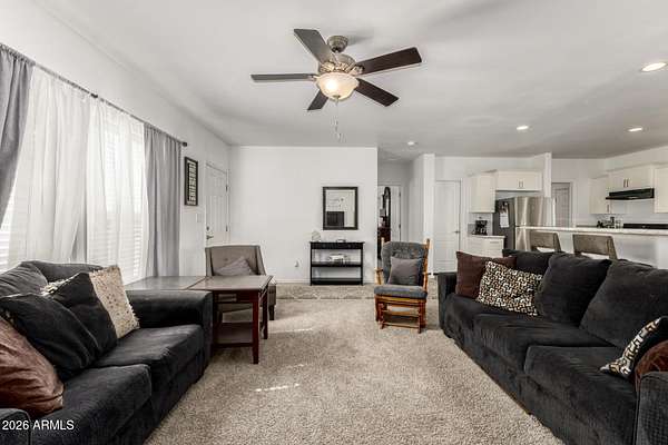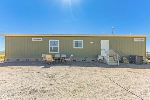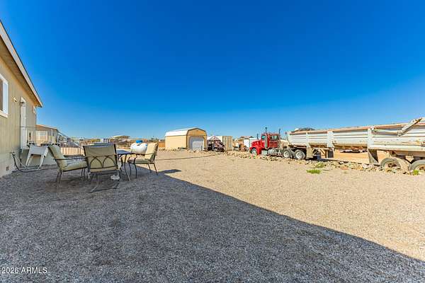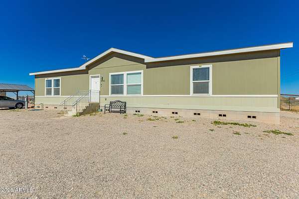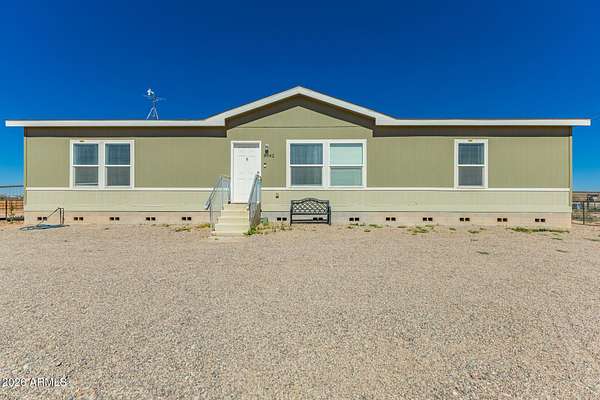 Built in 2023, this 3-bedroom, 2-bath multi-wide manufactured home sits on 1.66 fully fenced acres in Pinal County with mountain views and no HOA restrictions. The 1,620 sqft split floor plan features vaulted ceilings, recessed LED lighting, dual-pane windows, solar screens, and an open-concept great room layout. The kitchen includes a gas range, kitchen island, walk-in pantry, and designated dining space. The primary suite offers a double vanity, private toilet room, and walk-in closet. Outside, the 72,310 sqft lot provides usable land for horses, RVs, equipment, trailers, or future improvements. Shared well and septic system already in place. FHA, VA, Conventional, and USDA financing eligible. Rare opportunity to own newer construction with acreage, flexibility, and no monthly HOA fees.
