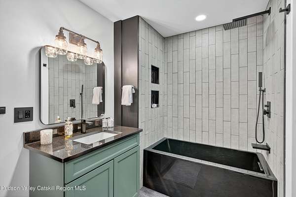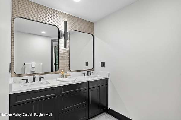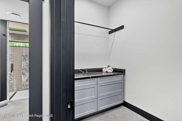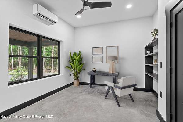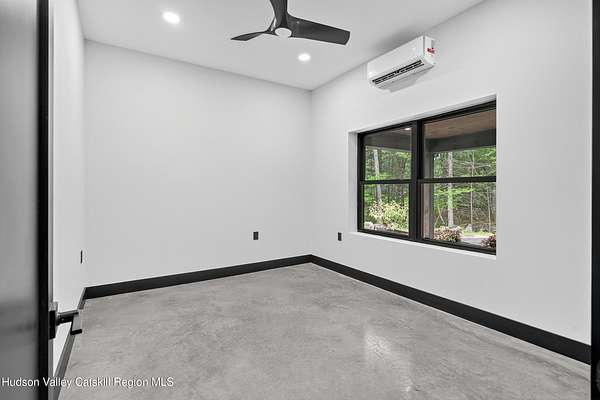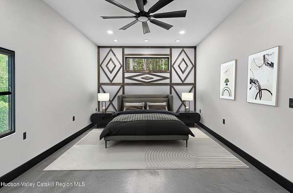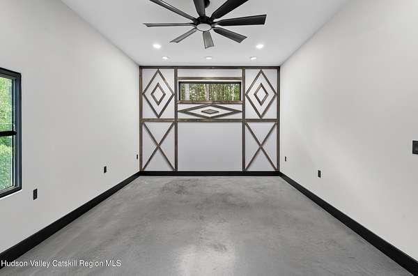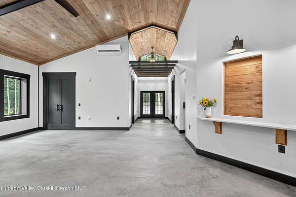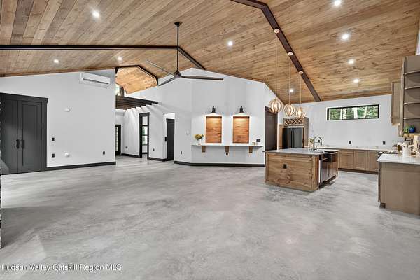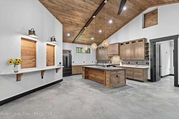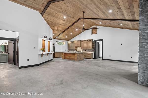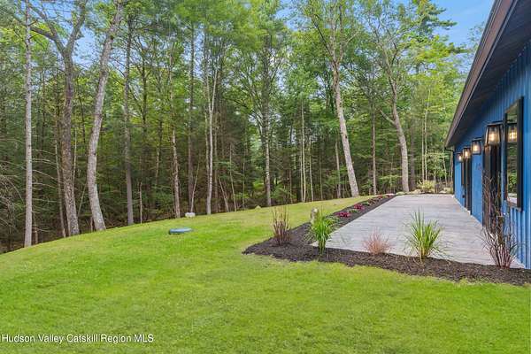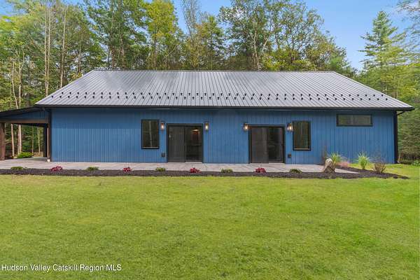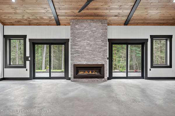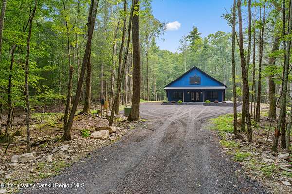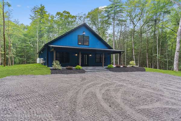 Another spectacular home just hit the market in the heart of the Catskills; The Black Diamond. Identified as Walnut Woods, this 2,160 square foot new construction home, boasts 3-bedrooms and 2-bathrooms. Its open concept, single level living space is exactly what you have been waiting for. Crafted and curated by Hamlet Builders, this model is nothing but a complete display of excellence. Arriving on site, you will recognize the great outdoor living space enjoying the covered porch and tremendous stamped concrete patio wrapping around the home. Greeted by 18-foot cathedral ceilings and paired with a pergola style entryway, the eye instantly catches the bold accents displayed in the entire home. Entering the home you will find 2 bedrooms fit for guests, office space or even full-time living usage. Moving forward into the main living area, find wood-stained ceilings, upscale Modern Forms lighting and a ventless propane fireplace is certainly the gathering space for all. Accompanied by black radiant heated, concrete finished floors, black doors and trim and a kitchen suited for a chef, this home really checks all the marks. Enjoy cooking with top-of-the-line Z-LINE appliances, plenty of counter space and even a fully lit breakfast bar, while enjoying the open concept of this home. Bringing the outdoors in, enjoy secluded nature views of the 2-acre parcel though the double sliding glass doors. The primary suite is more like a retreat with a tastefully designed diamond shaped accent wall, double closets and a step-down, marble-tiled rain shower with 7-additional heads. Moving outside to the wrap-around stamped concrete patio, you will find plenty of room to have an outdoor kitchen and entertaining space perfect for many summer memories to come. 805 Co Route 2 is backed by over 100 acres of privately owned land making the back yard a place where you can truly be in nature. Conveniently located, this home is just a short drive to local hiking hotspots, breweries and everything the Hudson Valley has to offer right at your finger-tips.