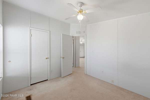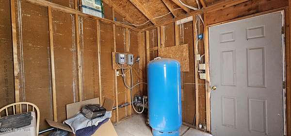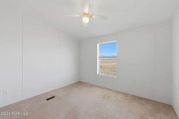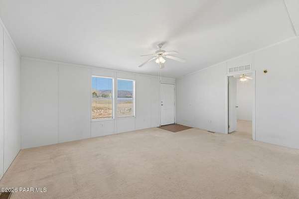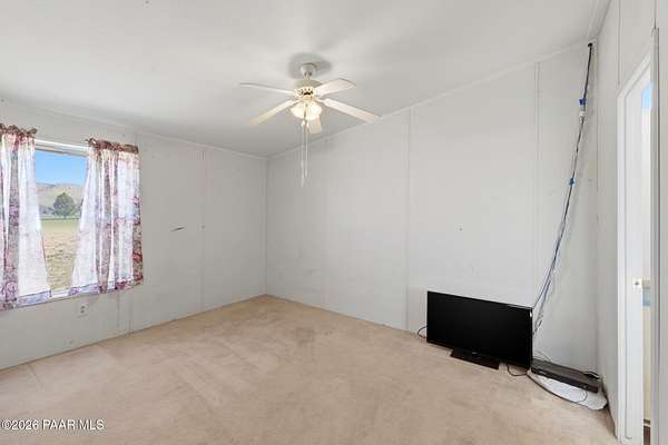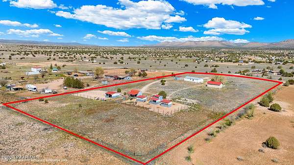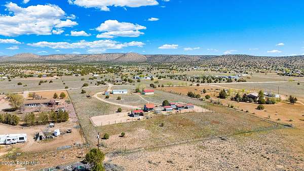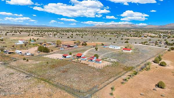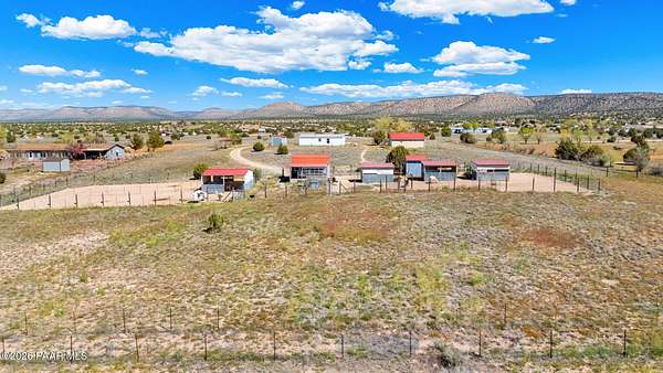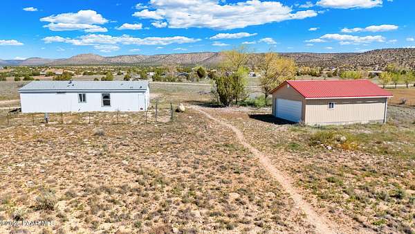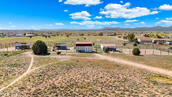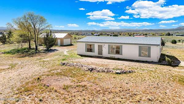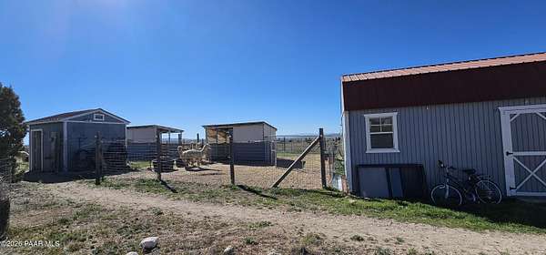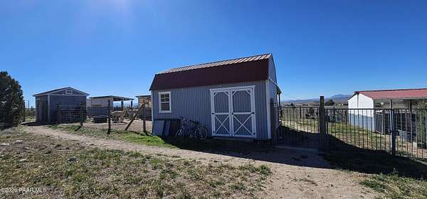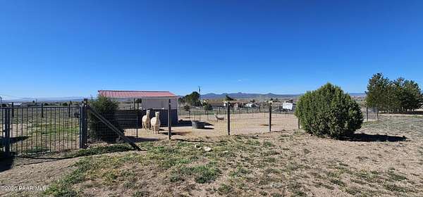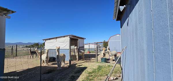 Perched on a gentle hilltop, this unique 5-acre property offers breathtaking 360-degree views of Big Black Mesa, Sullivan Buttes, Granite Mountain, and the Bradshaw and Juniper Mountains. With State Land just 1,000 feet away providing direct access to the Prescott National Forest, outdoor opportunities are truly at your doorstep. The 2002, 1200 SF, double-wide is positioned centrally on the fully fenced lot, which offers both privacy and panoramic scenery in every direction. The home has 3 bedrooms, and 2 baths and vaulted ceilings. This property is well-equipped for rural living or agricultural use. A high-producing private well with 5 acre-feet of water rights ensures reliable water access. The land is currently set up as an alpaca farm and includes perimeter fencing with gated entry, interior tertiary fencing, bio-security setup, and electric fencing surrounding five animal pens. Additional improvements include: a new (2024) 20x30 garage for vehicle or equipment storage, 12x20 barn with two lofts (built in 2012) for supplies or livestock use, 2 organic raised garden beds and a greenhouse structure. The home features a roof that is just 2 years old, while all other structures are topped with durable metal roofing. Conveniently located just 10 minutes from essential services in Paulden, including a fire station with emergency services, gas, groceries, hardware stores, a post office, and a K-8 public charter school (with high school in nearby Chino Valley). The property is serviced by the Chino Valley Fire Department and is not located in a flood zone. Whether you're looking to raise livestock, create a hobby farm, run a home-based business, or simply enjoy peaceful country living with room to roam, this property offers incredible versatility. With a little TLC and your personal touch, it could become your ideal country retreat.