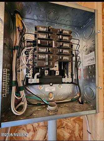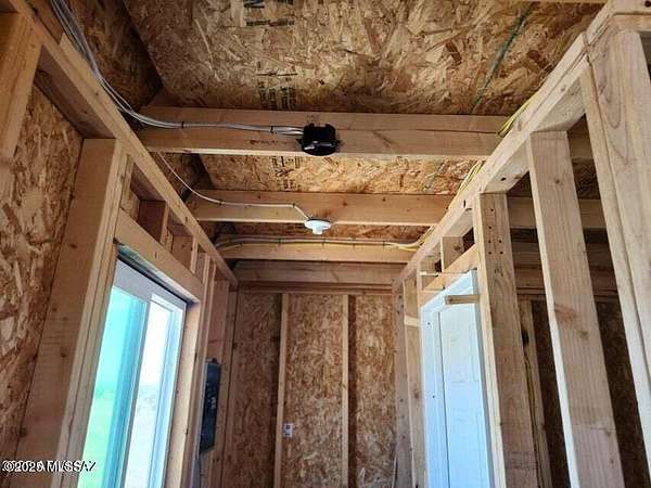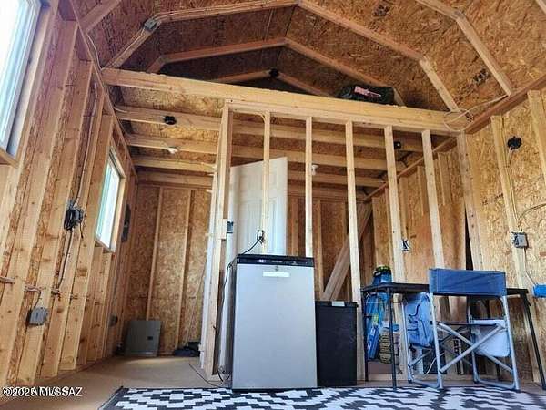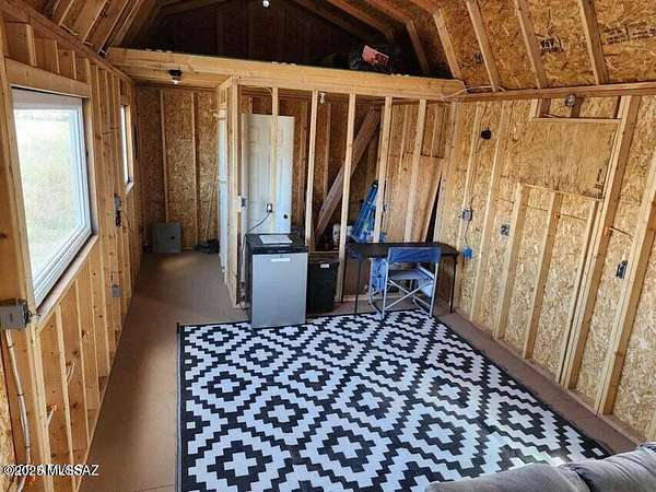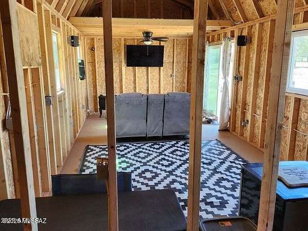 Est $227/moMini home with dramatic views of the Dragoon Mountains. This home is in the process of construction with permits in place. The property features two 1 acres lots, mini house, large water tank, 1,000 gallon septic tank, and solar panels. The home has double pane windows and sliding door installed. Electric wiring has been roughed in. The roof is metal and home has a loft. The power is one pole away from the property line.