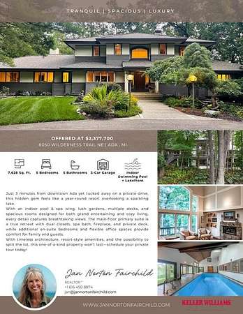 Private Luxury Retreat Just 3 Minutes from Downtown Ada! Tucked away on a private drive off Honey Creek, on a gorgeous lot overlooking a small sparkling lake, this extraordinary home offers tranquility & resort-style living. Enjoy kayaking or paddleboating on the lake, a spectacular indoor pool & spa wing, multiple decks & lush gardens ~ your own year-round private escape! Architecturally designed to capture stunning views from every room, this home includes 4 ensuite bedrooms, 3 private offices (poss. additional bedrooms). Romantic owner's suite has dual walk-in closets, whirlpool tub, walk-in spa shower, private deck. Entertain with ease in the large light-filled kitchen, enormous living & dining rooms, breakfast room with skylights & family room with fireplace +sliders to outdoor dining. Billiards/game room, library, workout room, main floor laundry, freshly painted 3+stall garage. May be possible to split the lot. A rare hidden gem in Ada! Schedule your private showing today! * Enjoy resort style living in this Private Luxury Retreat! Custom built with such quality and vision that many of the extras are just now showing up in higher end homes. I am quite sure you would not be able to replicate this home on this gorgeous lot and all it has to offer for anywhere near this price. So many extras! Stunning high ceilings & walls of glass allow sunshine to give this home a wonderful happy glow and great energy. Designed for comfort as well as entertaining, it even has a 'Lazy waiter' in 2nd kitchen for sending food/pool/party foods etc. to pool entertainment level. Owner's suite has sitting area overlooking lake, french doors to an office/library (nursery) with fireplace. Owners bath with double vanities & lg mirrors, multi body spray shower, heated towel bars, large whirlpool soaking garden tub, two walk in closets, hidden safe. Tons of large closets throughout & rooms for storage and possibly for an elevator if needed. No steps door to walkout level, 3+ stall garage, pool and enormous living areas with 6 sets of sliders (9 sliders total in home!)! If we ever had another pandemic, this is the place to live! With the possibility of a split for another building spot, what a great space for multigenerational living for mom/dad or your children & grandkids. Newer mechanicals: Newer roof (11/2023), 2 furnaces(6 yrs), 2 AC (6 yrs), 2 hot water heaters (1 yr) Assoc. fee is $1080/ yr for snowplowing maintaining road & common areas.