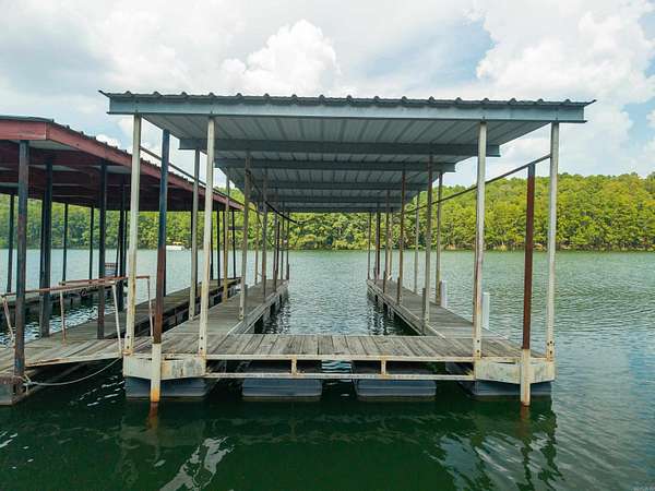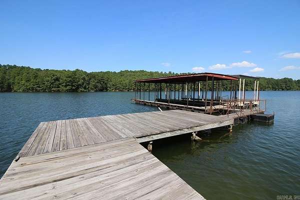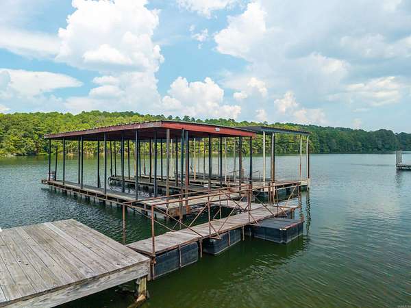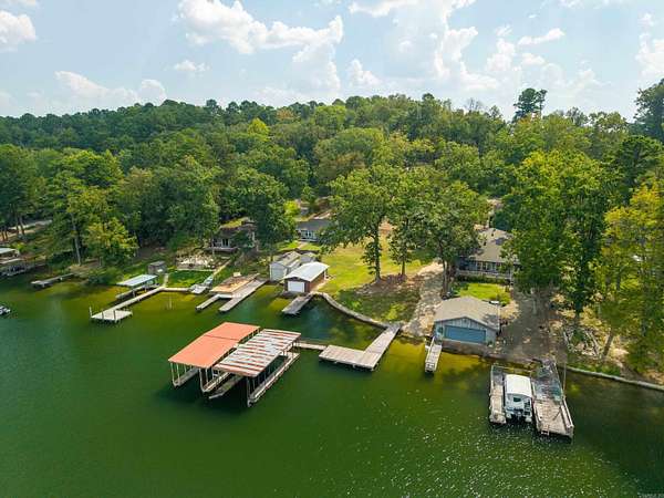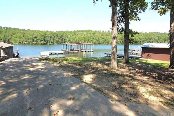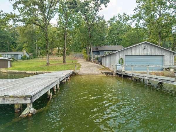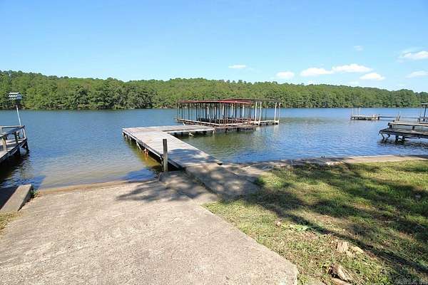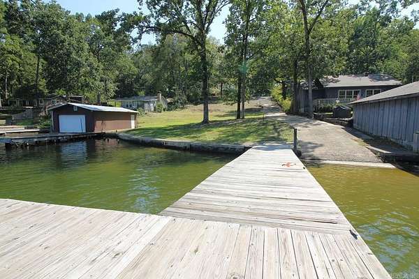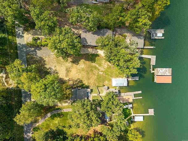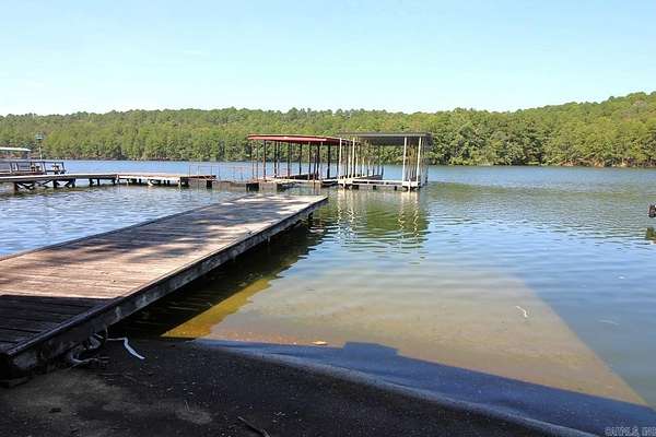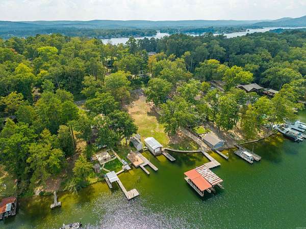 Lake lot on Lake Hamilton ready for your new home. .58 acre with 107 feet on the lake. Launching ramp, swim dock & two stall covered boat dock, concrete seawall all permitted. Most of the lot is above flood plain giving plenty of room for a home & gentle walk to the lake. City water meter & electrical meter pole in place. Pressure city sewer at the street. Located a short drive from Garvin Woodland Gardens. Survey on file. 16X35 ft. shop with roll up door that opens to a launching ramp into lake. 11X7 shop door. 8X32 pier adjacent to shop. 32 ft long pier out to 12X24 swim platform. Both boat stalls are 9'8" wide X 34 long X 9'6" high. Winter water with water depth in stalls at 9+ feet. Entergy permitting info on file.