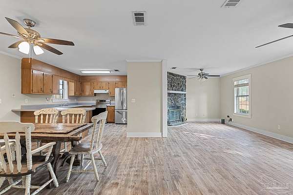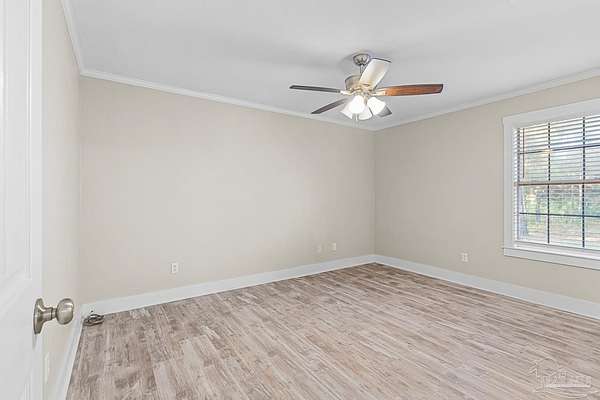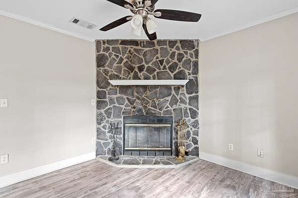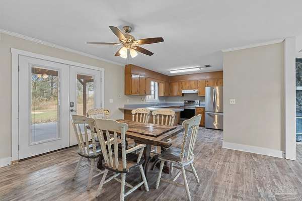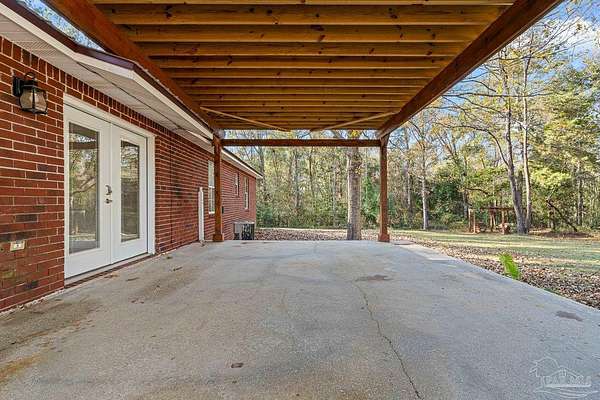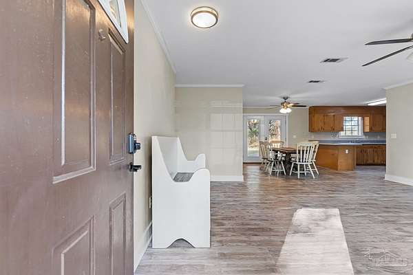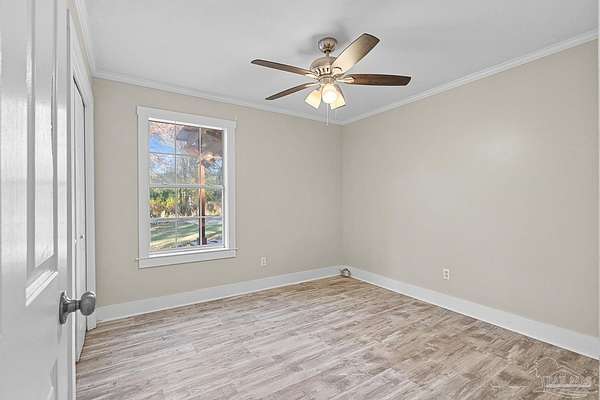 Country Living at an Affordable Price Point - $240,000! Welcome to 8061 Burley Ln., Century, FL, a quaint four-sided brick home with metal roof, offering long-term durability and structural assurance while perfectly positioned on over 2 acres of private land surrounded by beautiful pine trees. This property offers the ideal blend of privacy, affordability, and peaceful country living, making it a rare find. Inside, you'll find a turn-key interior featuring 9-foot ceilings, durable luxury vinyl plank flooring running seamlessly throughout the home, while 4-inch baseboards, crown molding, and ceiling fans add both style and efficiency- all complemented by neutral paint tones that enhance the natural light streaming in from french patio doors with built in blinds for added convenience. The bathrooms feature updated vanities with quartz countertops, offering a clean modern finish. If you're looking for space, privacy, and country charm at an attainable price, this property delivers exceptional value and opportunity.