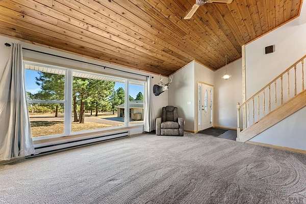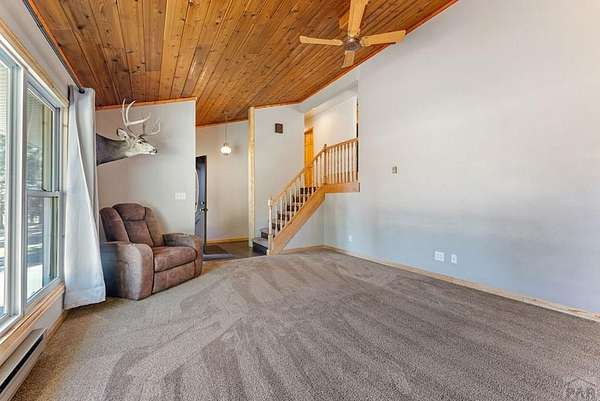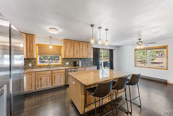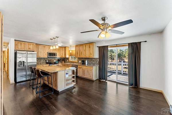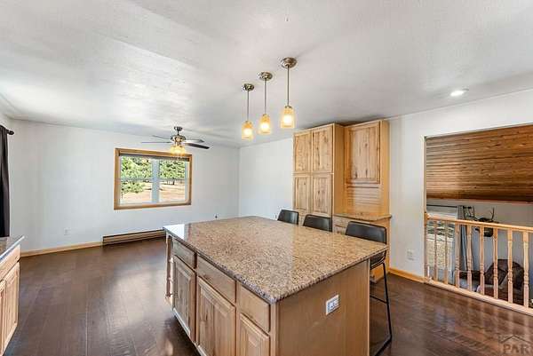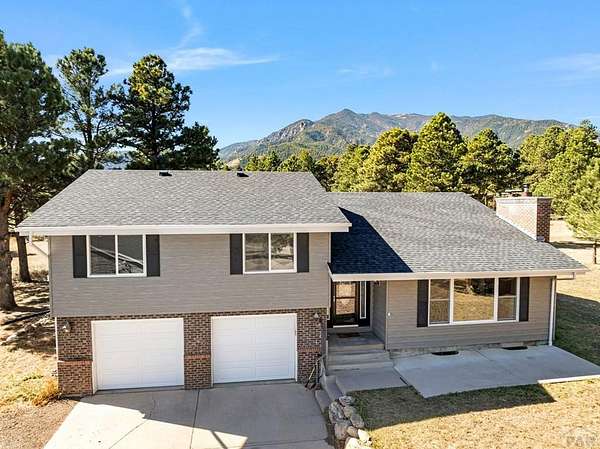 Nestled in the foothills of the Greenhorn Mountains, this newly remodeled four-bedroom, three-bath home sits on over three acres of well mitigated Pond covered property. Featuring a two-car attached garage and a detached three-car garage currently used as a shop, this property offers both comfort and functionality in a peaceful mountain setting. Step inside to an inviting living room complete with a charming brick fireplace and a large picture window that floods the space with natural light. The spacious kitchen is a cook's dream, boasting granite countertops, stainless steel appliances, solid wood cabinetry, engineered hardwood flooring, and ample space for a full-size dining table. From the kitchen, walk out onto the expansive wraparound deck, perfect for entertaining or relaxing while taking in the mountainous views. The generous master suite features a luxurious en-suite three-quarter bath with double sinks, a large walk-in tile shower and a large walk-in closet. The two additional large bedrooms located on the upper floor also offer comfortable accommodations. Downstairs, the finished basement includes a cozy family room, an additional bedroom, plenty of storage, and direct access to the oversized two-car garage. The exterior of the home is outfitted with durable metal siding and additional amenities include a dog run, a spacious detached garage/shop, and plenty of room for outdoor living and recreation. This property is just minutes from nature and convenience.