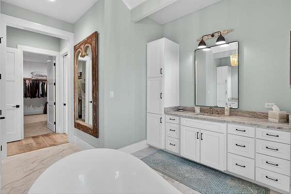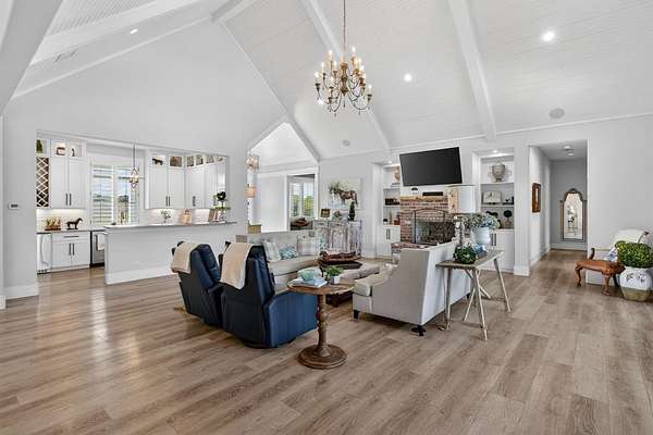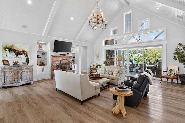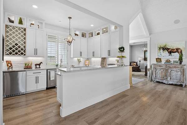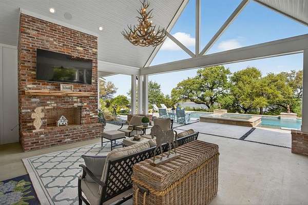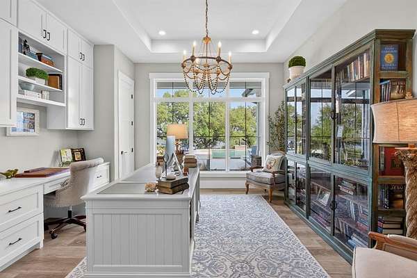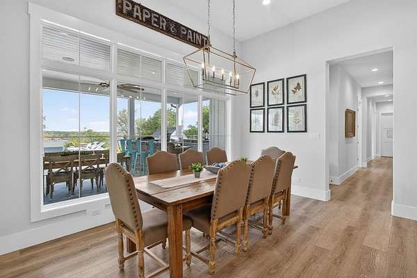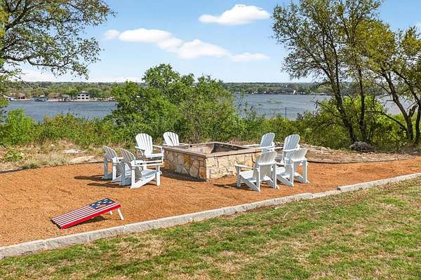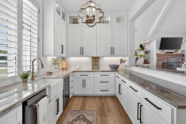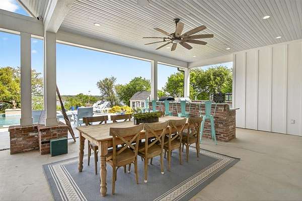 A modern farmhouse that exceeds imagination. Inviting, livable, & stunning! This exquisite custom home embodies luxury living with the most sensational views of Lake Granbury. Attention to detail was put into every aspect of this home. Step into this grand family, entertaining space with a wall of windows to capture the views. A full entertainment bar room with a sink, storage, ice machine, and refrigerators. A full prep kitchen with sink, extra dishwasher, with ample storage & counter space. The dining room captures the views at every meal. 5 en-suite bedrooms with walk-in closets. Massive laundry & craft room. Technology closet with security monitoring. 2 executive offices that are spacious & have plenty of storage. The primary suite features a cathedral ceiling, stunning views, 2 massive closets, a podcast room, and a spa-like bath with a free-standing tub & a huge walk-in shower. 4 bedrooms with baths are all on the first level. A large 5th bedroom features 8 custom-built-in bunks. A workout room and a separate workshop. There is a large upstairs storage room with a Versa Lift, so bringing your decorations up or down is super easy. 4-car oversized garages open to the side of the home. Lovely, large backyard with many amenities. A gorgeous vaulted covered porch with a fireplace, outdoor kitchen, & eating area. The pool & hot tub with views of the lake. Firepit, vegetable garden, and an adorable gardening cottage that has AC & electricity will be a favorite escape. The home was thoughtfully designed and features high-end designer fixtures throughout. Unbelievable, adequate storage throughout this home. There is even a custom doggie room under the stairs in the utility room. The circular drive with the additional parking is ideal for entertaining needs. This modern upscale farmhouse exterior is a timeless classic. So much to love about this property. Agent is owner of this property.