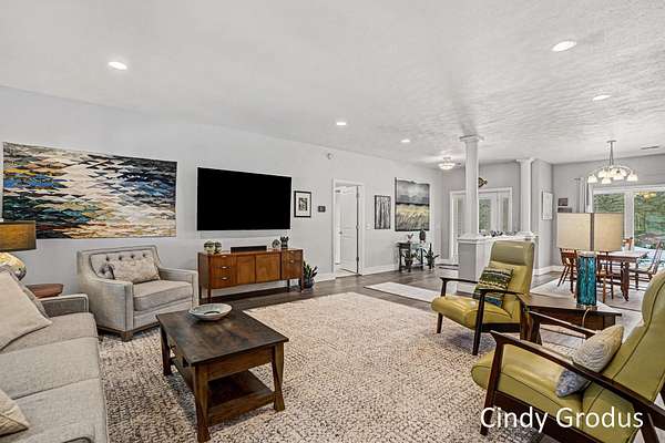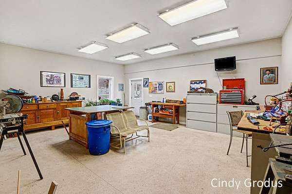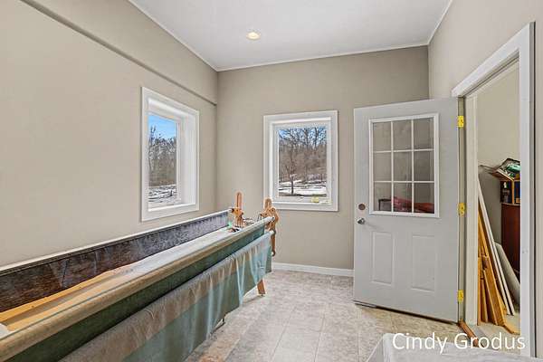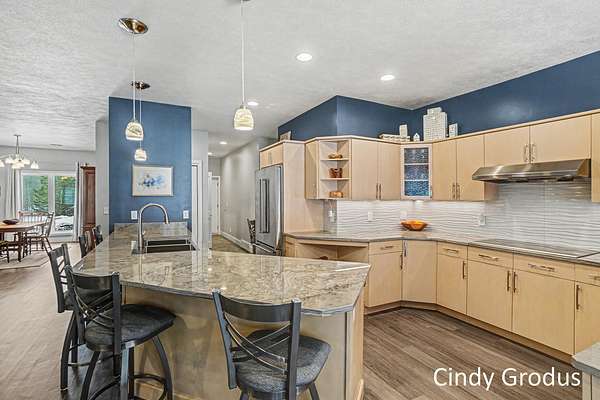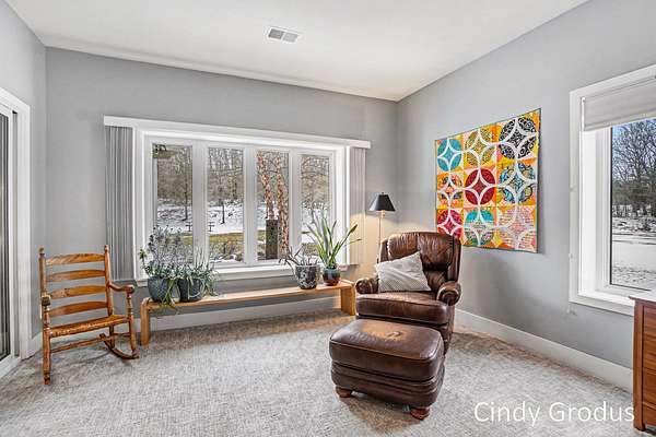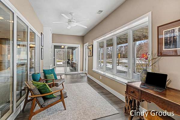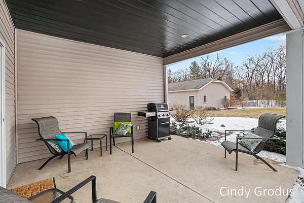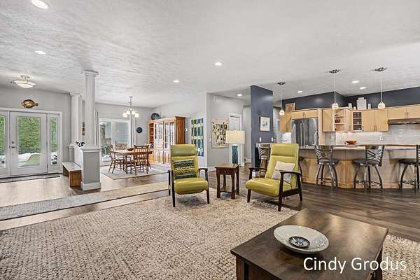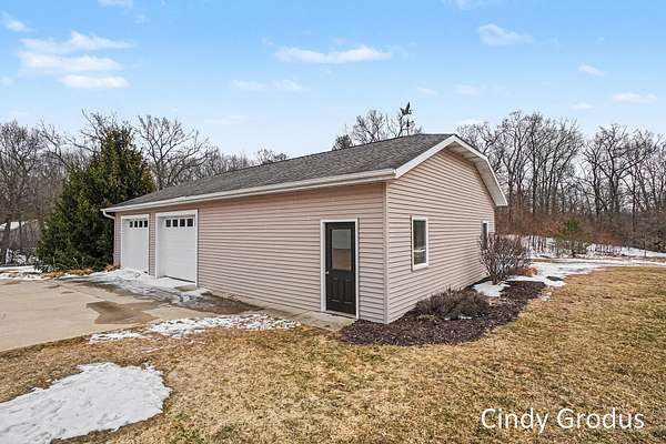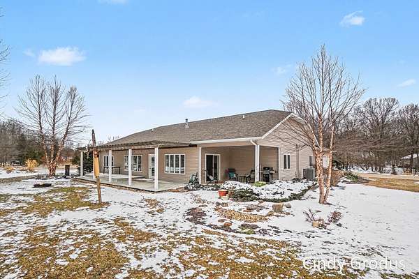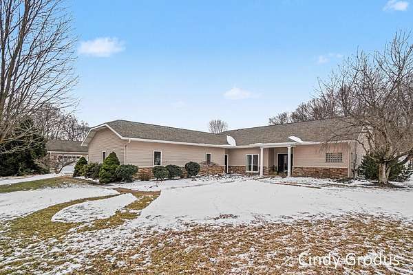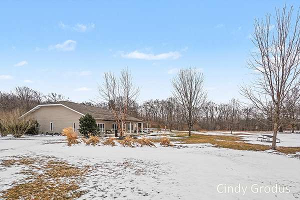 Welcome home to this special custom-built, zero step ranch nestled at the end of Pigeon Creek Dr, a private road. Featuring 3 bedrooms, 3 bathrooms, it spans over 2800 finished sq.ft. and sits on 4 acres. The outdoor living spaces feature a covered patio, massive deck across the back with a pergola and floor to ceiling windows. Step inside to a stunning open concept floor plan with 9-foot ceilings and 3-sided fireplace perfect for everyday living and entertaining. The fabulous kitchen with new quartzite countertops, wavy tile backsplash, newer stainless steel appliances, large snack bar, and a cozy breakfast nook, beautifully reflect the natural surroundings. The enormous primary suite is a luxurious retreat offering plenty of room for relaxing, dual sinks, a soaker tub, a zero-step tile shower, and a spacious walk-in closet. The split floor plan features a Jack & Jill bathroom between the two generous bedrooms both with large walk-in closets. Additional highlights include an 3-stall attached garage with tons of storage, and a 30x50 outbuilding with 2 more parking stalls and 2 heated finished work spaces. Adjacent to Hemlock Crossing, this amazing location boasts easy access to hiking trails and the Pigeon River. Kayak or paddle board out to Pigeon Lake and Lake Michigan or hike, snowshoe, cross-country ski the numerous nature trails - all from your backyard. This exceptional residence is thoughtfully designed to harmonize with its natural surroundings delivering privacy and seamless access to the outdoors.