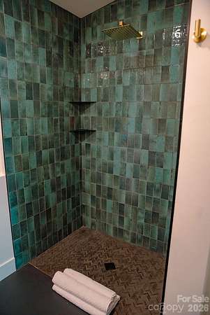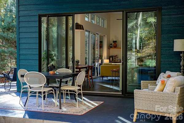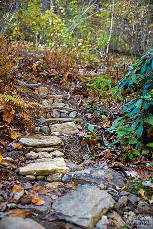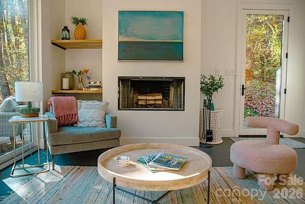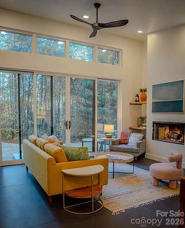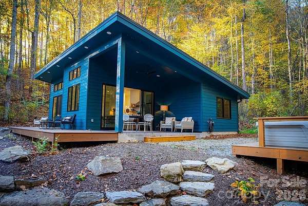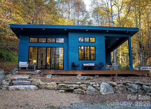 Nestled between Asheville and Hendersonville, this modern 2BD/2BA custom home sits on 6.89 private acres of rhododendron forest and mature hardwoods. Large picture windows and sliding doors invite the forest and creek to blend seamlessly into the interior. While spacious bedrooms and luxurious bathrooms anchor each side, creating a true sanctuary. Unwind in the spa-like primary bath equipped with walk-in shower and large soaking tub, where open windows allow you to relax to the sounds of the adjacent creek. Enjoy an open floor plan with 12' vaulted ceilings, cozy fireplace, and energy efficient passive solar design. The well appointed kitchen includes gas range, spacious cabinets, and plenty of counter space. An abundance of outdoor living with wrap around covered decks, walking/hiking paths, fire pit, and creekside hot tub. Hike through rhododendron forests and creekside trails to waterfalls and cold plunge pools. Build your dream home on the flat acreage leading to the cabin or add an additional rental income producing unit while still having plenty of privacy. This unique modern home holds all the elements for a stunning primary residence, spectacular mountain getaway, and/or successful vacation rental. Underground utilities, fiber optic internet, and generator in place. Well maintained private roads anchor the access to this community of 10 mountain homes. 24 miles to Asheville, 7 miles to Chimney Rock, 8 miles to Lake Lure, 5 miles to Hickory Nut Gorge Trailhead, and 30 miles to Hendersonville. Sold fully furnished and turn key. Currently a successful 5-star short term vacation rental.