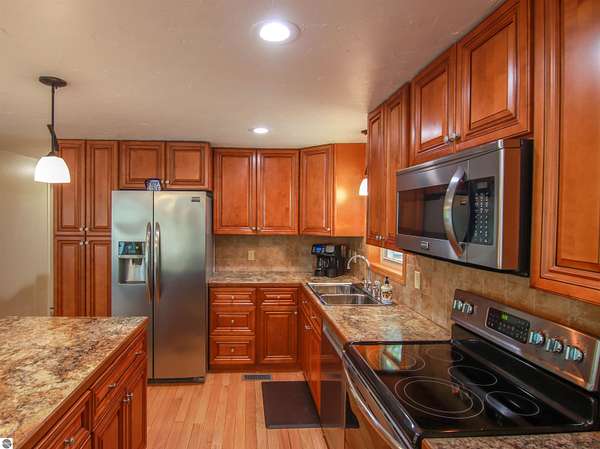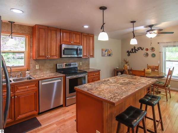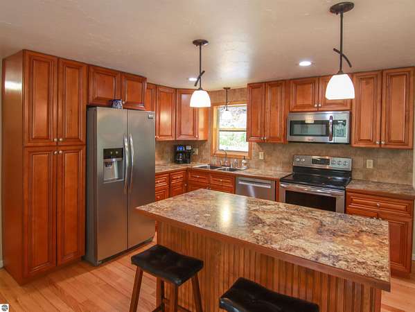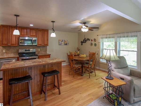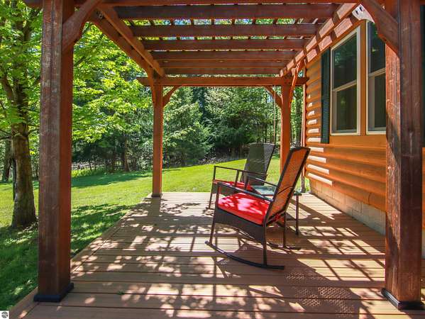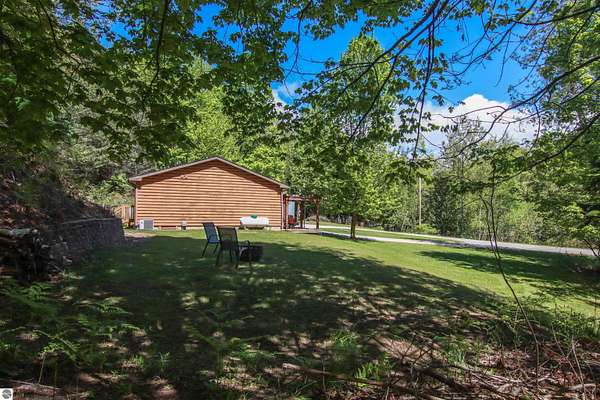Tucked on nearly 4 acres just outside Beulah, this inviting log-sided home offers the kind of Up North setting buyers are always hoping to find. Cold Creek winds through the front of the property, creating a peaceful backdrop that draws in wildlife and adds to the natural beauty of the setting. Whether you are enjoying coffee on the deck beneath the pergola or taking in the quiet surroundings, this property feels like a true Northern Michigan retreat. Inside, the home is bright, well cared for, and move-in ready with 2 bedrooms, comfortable main floor living, and quality updates throughout. Identified as manufactured construction, the home was assembled on a permanent wood frame, set on a block foundation and features wood frame construction, a solid feel, and a level of comfort and finish that may exceed expectations. Hardwood floors add warmth to the living space, while the nicely updated kitchen, central air, pellet stove, and thoughtful improvements make the home easy to enjoy in every season. Recent enhancements include new windows in 2022, a new well and on-demand hot water in 2023, plus a new water softener and dishwasher in 2024. Outside, the paved driveway leads to a 24x40 pole barn with excellent room for vehicles, boats, and recreational gear, along with an additional 12x10 storage shed. The location is a strong part of the appeal, just minutes from downtown Beulah, Crystal Lake, and nearby golf. With its beautiful creek frontage, privacy, and strong outdoor lifestyle appeal, this property would make an ideal year-round home, weekend getaway, or investment opportunity with short-term rental potential.