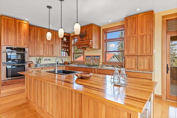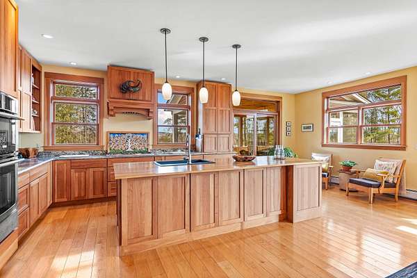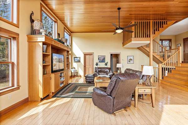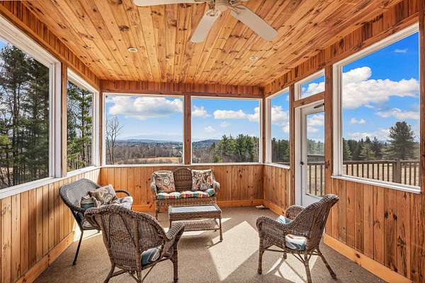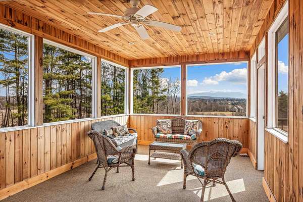 Set on over 10 private acres in Essex with breathtaking views of Mt. Mansfield, this exceptional gambrel-style home blends craftsmanship, comfort, and natural beauty in perfect harmony. Step inside through a knotty alder front door to find warm, inviting spaces filled with thoughtful details, including a custom oak staircase and a stunning great room with Douglas fir ceilings and floor-to-ceiling windows that frame the mountain views. The chef's kitchen features handcrafted cherry cabinetry, premium appliances, and a large pantry that includes a second kitchen--perfect for keeping prep and cleanup out of sight while entertaining. Just beyond, a screened-in porch invites you to enjoy your morning coffee while watching the sunrise. In a separate wing, two guest bedrooms share a full bath and a cozy loft space above. The upper level is devoted to the expansive primary suite, complete with a sitting area, private balcony, and spa-like bath with soaking tub and tiled shower. The lower level offers a den with a stone fireplace, office or flex space, laundry room, and an additional guest suite. A two-car attached garage and three outbuildings provide abundant heated workshop and storage space, perfect for hobbies, vehicles, or equipment. Private and peaceful yet just minutes from the heart of Essex, this property is a rare Vermont retreat designed for living, working, and relaxing in style.