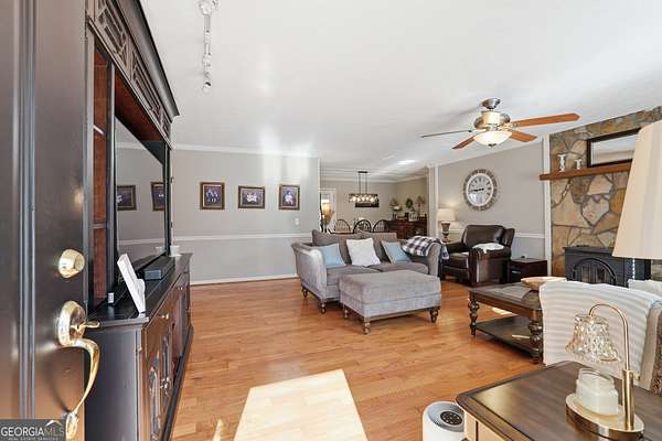 Welcome to this beautifully maintained 4-bedroom, 3.5-bath home featuring two master suites-perfect for multi-generational living or guest accommodations! The main master boasts a soaking tub, separate shower, and serene privacy, while the second master includes a full tub/shower. The heart of the home is the open kitchen and breakfast room, complete with solid surface countertops (likely Corian), flowing seamlessly into the family room with a cozy wood-burning stand-alone heater. The main floor features all hardwoods and tile, including the laundry/mud room with a built-in folding table for convenience. Upstairs, a large bonus room with a half bath - this is a perfect teen retreat, home office, or hobby space. Outside, enjoy the fenced yard with patio and deck-ideal for entertaining or playtime for your adorable pups. A two-car carport adds extra convenience. This home truly combines thoughtful updates, functional spaces, and comfortable living in every corner.