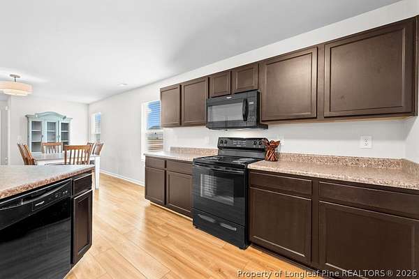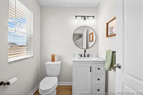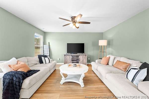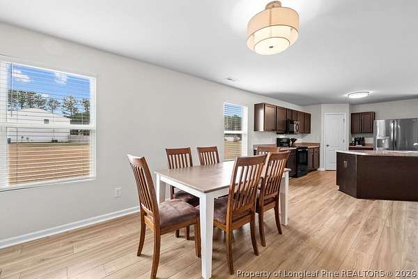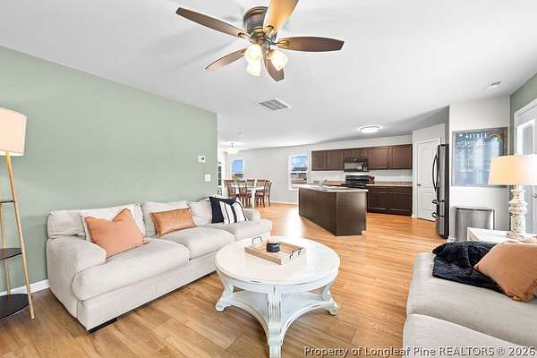 A Country Beauty with design upgrades on over 1.5 acres! This move-in ready 4 bedroom, 2.5 bathroom home has all common areas downstairs, with bedrooms and laundry upstairs! Design updates include LVP flooring throughout the bottom floor, updated lighting fixtures, 2" blinds throughout, and accent walls and interior paint. Primary suite includes bathroom ensuite with double vanities, walk-in shower, and walk-in closet. Enjoy outdoor entertaining in your huge backyard with extended back patio. Upgraded french door, double-freezer refrigerator, and Washer/Dryer included! Located LESS than 30 minutes from All American ACP, and just 50 minutes from the heart of Raleigh, this rural location is both practical and great for lifestyle! USDA-loan eligible.