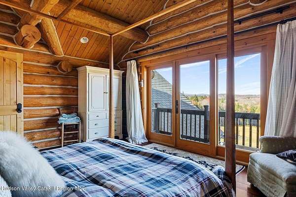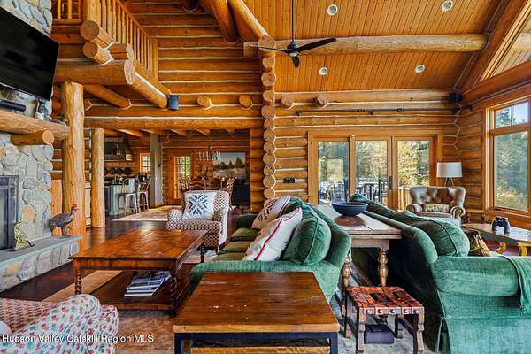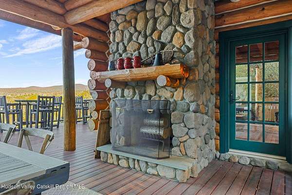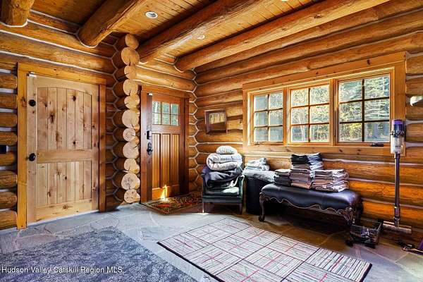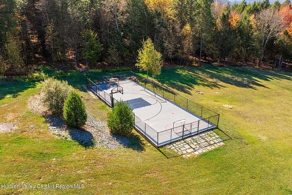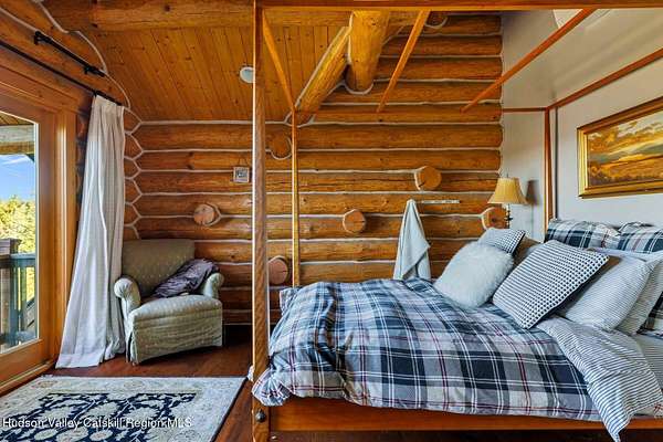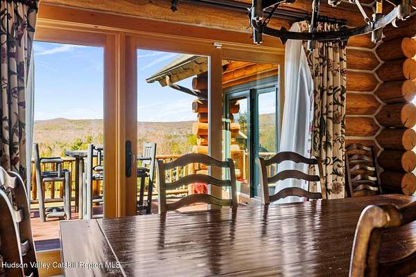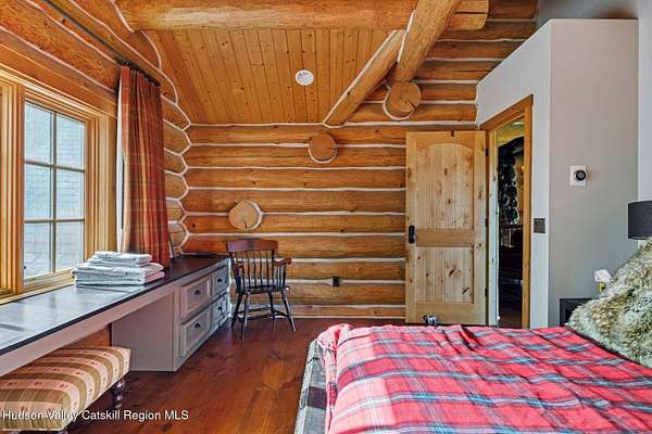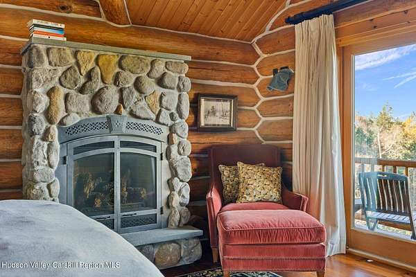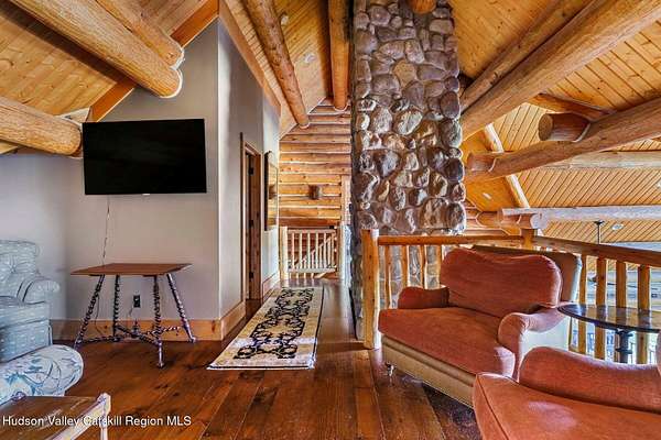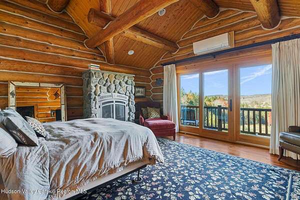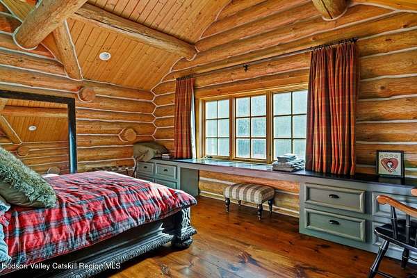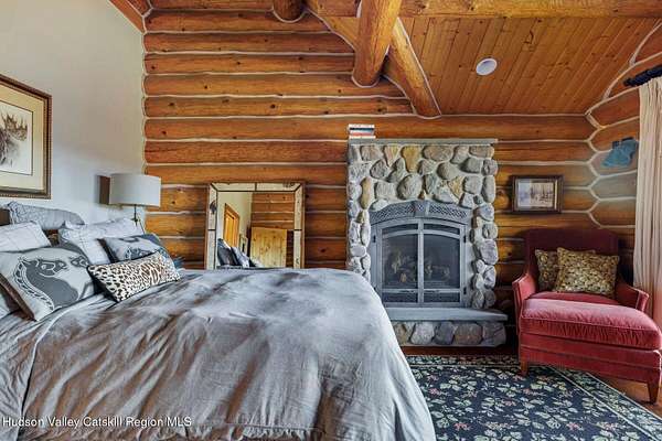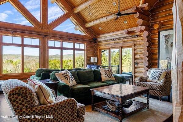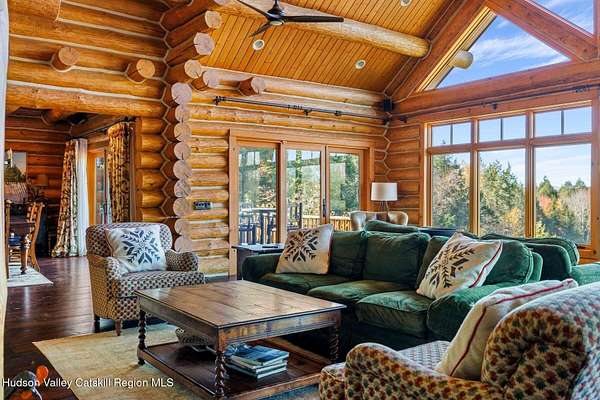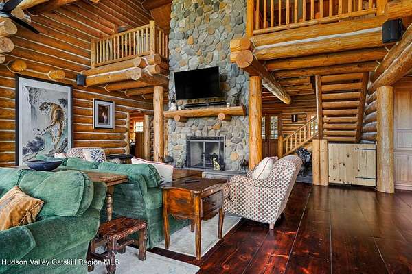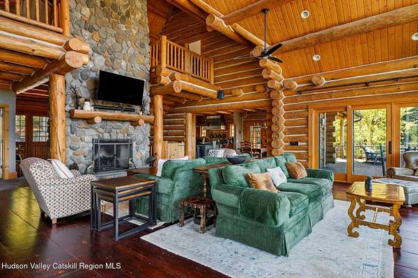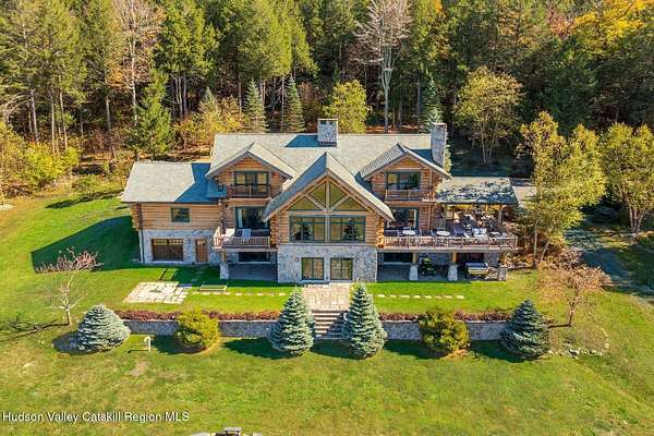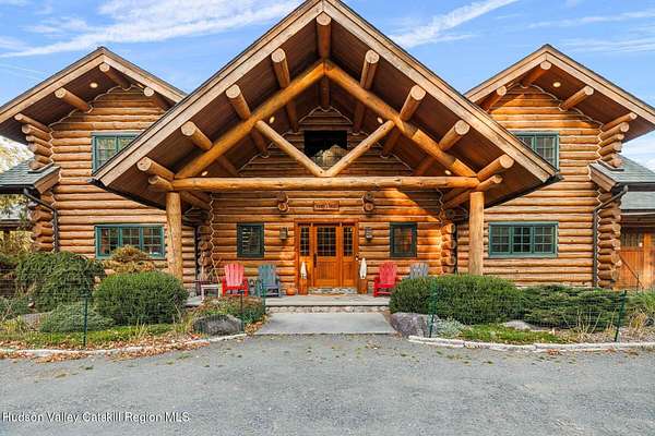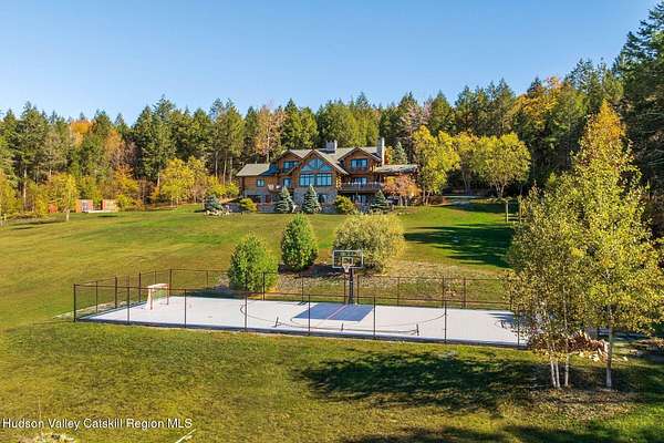 Secluded Mountain Estate with 20+ Acres, Panoramic Views & Sport Court in Windham, NY. Privately gated at the very end of Sundance Drive, this extraordinary log estate is one of only five luxury homes in this sought-after enclave each on expansive land, but none offering the privacy, scale, or setting of this one. Set on a sweeping tract with panoramic mountain views, this home blends refined craftsmanship with rustic elegance in a way few properties ever do. Inside, you're welcomed by soaring vaulted ceilings clad in pine, wide-plank cherry-stained wood floors, and custom finishes throughout. The open-concept layout centers around a jaw-dropping great room with a two-story wall of glass and a dramatic stone fireplace. From there, the space flows seamlessly into a chef's kitchen outfitted with commercial-grade stainless steel appliances, dual dishwashers, copper farmhouse sinks, stone countertops, and handcrafted copper lighting that echoes throughout the home. Multiple French doors open to a wraparound deck designed for all-season use, complete with an outdoor fireplace and a covered, wired section ideal for enjoying snowfall or rain in comfort. With six spacious bedrooms, several featuring fireplaces and balconies, the home is made for hosting or relaxing in peace. The primary suite includes custom built-ins, a fireplace, and a spa-style bathroom with forest and mountain views. The main level also offers a dedicated office and ski/boot room. Throughout the home, you'll find a rich mix of wide-plank wood, slate, and bluestone flooring, adding to the upscale mountain lodge aesthetic. The finished walkout level expands your living space significantly with additional bedrooms and bathrooms, a beautifully designed wet bar with copper accents and a third dishwasher, and a wine and cigar room. A dual-sided fireplace connects the large family room with a card/game area, and a fitness center is discreetly tucked off to the side. A second laundry area here complements the one on the main floor for added convenience. No detail was overlooked in construction or design. The home includes full surround sound, air conditioning, a whole-house generator, 8-year-old composite slate replica roof with 50-year warranty, composite decking, and both attached and detached garage spaces. The grounds are just as spectacular as the interior. Professionally landscaped with stone walls, walkways, and mature gardens, the property also features a fire pit gathering area, a full-size sport court with basketball and tennis setup, and acres of manicured lawn and private woods perfect for hiking or quiet exploration. This is a once-in-a-lifetime opportunity to own a private mountain estate less than 1.5 miles from town and just 2 miles from Windham Mountain Ski Resort. Designed for comfort, built for generations, and surrounded by nature, this is more than a home, it's a legacy property. A 3D Walkthrough Tour is available in the digital Lookbook or by request from the listing agent.