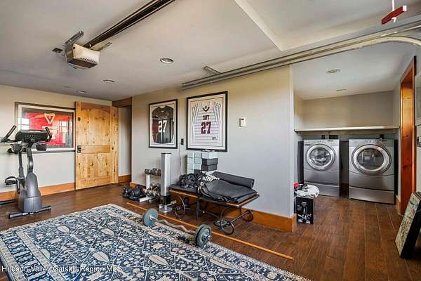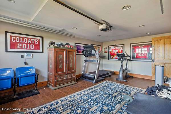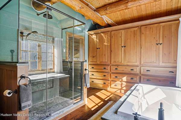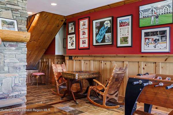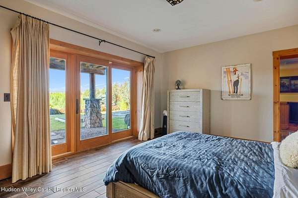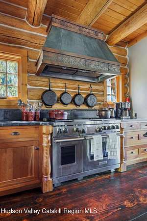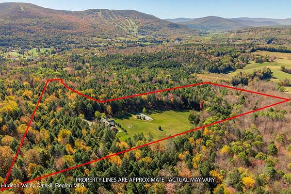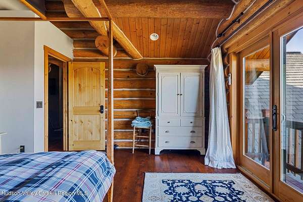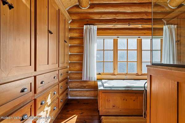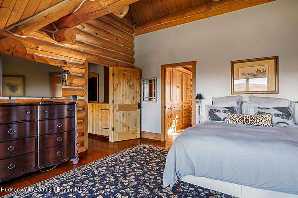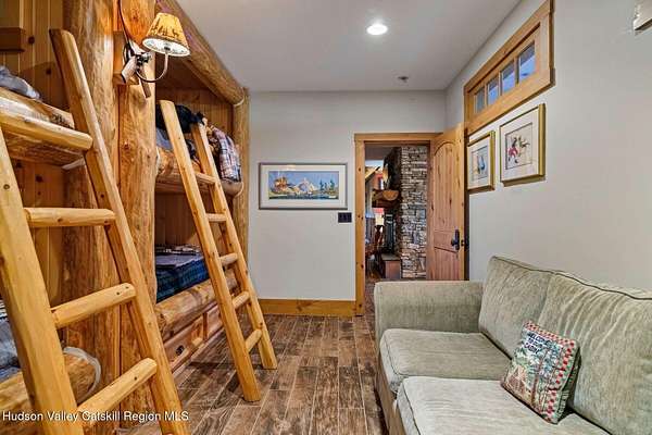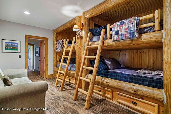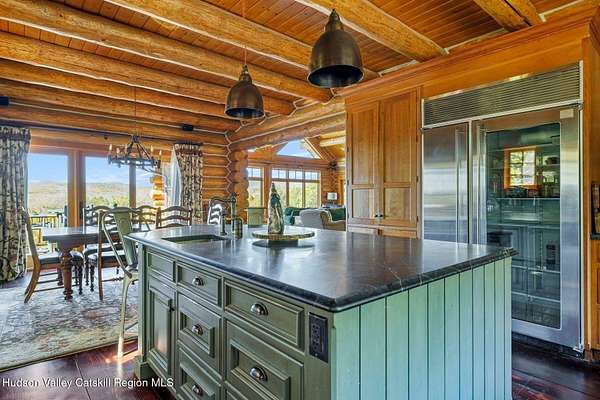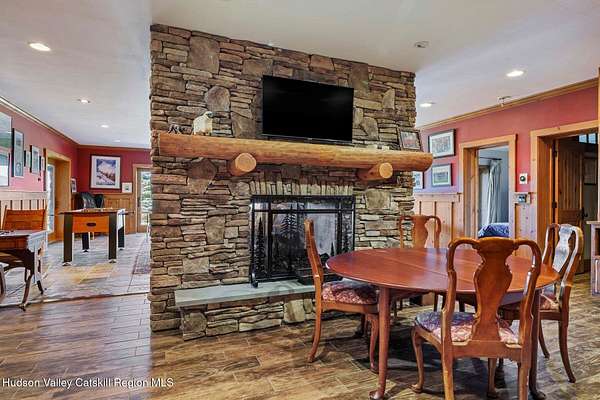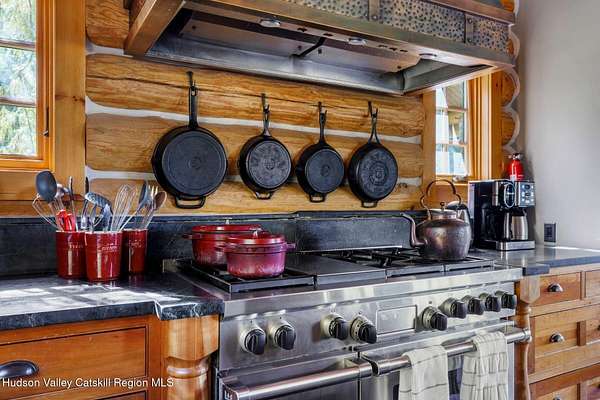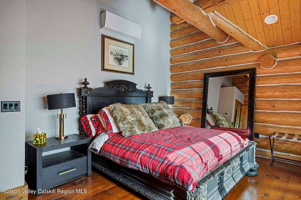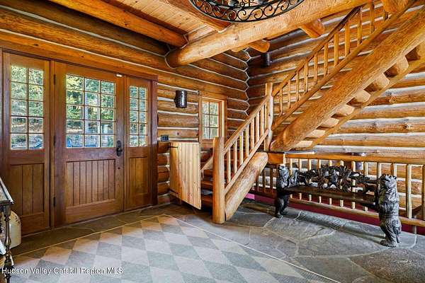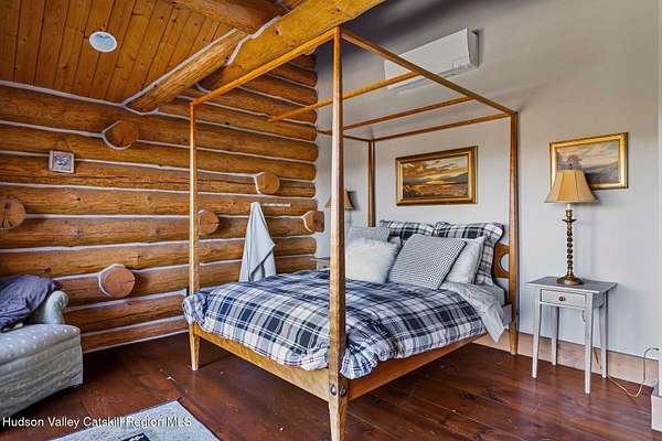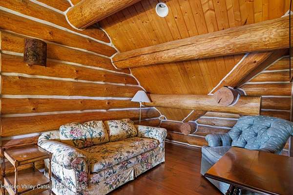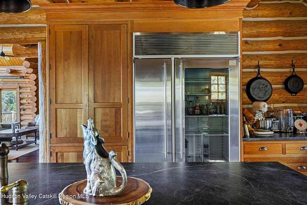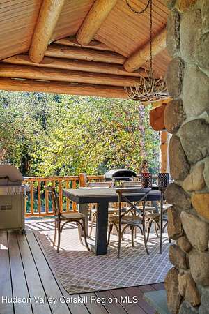 Secluded Mountain Estate with 20+ Acres, Panoramic Views & Sport Court in Windham, NY. Privately gated at the very end of Sundance Drive, this extraordinary log estate is one of only five luxury homes in this sought-after enclave each on expansive land, but none offering the privacy, scale, or setting of this one. Set on a sweeping tract with panoramic mountain views, this home blends refined craftsmanship with rustic elegance in a way few properties ever do. Inside, you're welcomed by soaring vaulted ceilings clad in pine, wide-plank cherry-stained wood floors, and custom finishes throughout. The open-concept layout centers around a jaw-dropping great room with a two-story wall of glass and a dramatic stone fireplace. From there, the space flows seamlessly into a chef's kitchen outfitted with commercial-grade stainless steel appliances, dual dishwashers, copper farmhouse sinks, stone countertops, and handcrafted copper lighting that echoes throughout the home. Multiple French doors open to a wraparound deck designed for all-season use, complete with an outdoor fireplace and a covered, wired section ideal for enjoying snowfall or rain in comfort. With six spacious bedrooms, several featuring fireplaces and balconies, the home is made for hosting or relaxing in peace. The primary suite includes custom built-ins, a fireplace, and a spa-style bathroom with forest and mountain views. The main level also offers a dedicated office and ski/boot room. Throughout the home, you'll find a rich mix of wide-plank wood, slate, and bluestone flooring, adding to the upscale mountain lodge aesthetic. The finished walkout level expands your living space significantly with additional bedrooms and bathrooms, a beautifully designed wet bar with copper accents and a third dishwasher, and a wine and cigar room. A dual-sided fireplace connects the large family room with a card/game area, and a fitness center is discreetly tucked off to the side. A second laundry area here complements the one on the main floor for added convenience. No detail was overlooked in construction or design. The home includes full surround sound, air conditioning, a whole-house generator, 8-year-old composite slate replica roof with 50-year warranty, composite decking, and both attached and detached garage spaces. The grounds are just as spectacular as the interior. Professionally landscaped with stone walls, walkways, and mature gardens, the property also features a fire pit gathering area, a full-size sport court with basketball and tennis setup, and acres of manicured lawn and private woods perfect for hiking or quiet exploration. This is a once-in-a-lifetime opportunity to own a private mountain estate less than 1.5 miles from town and just 2 miles from Windham Mountain Ski Resort. Designed for comfort, built for generations, and surrounded by nature, this is more than a home, it's a legacy property. A 3D Walkthrough Tour is available in the digital Lookbook or by request from the listing agent.