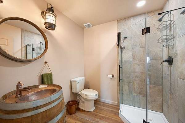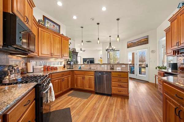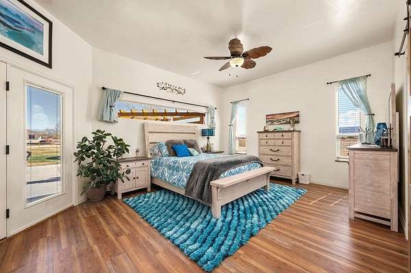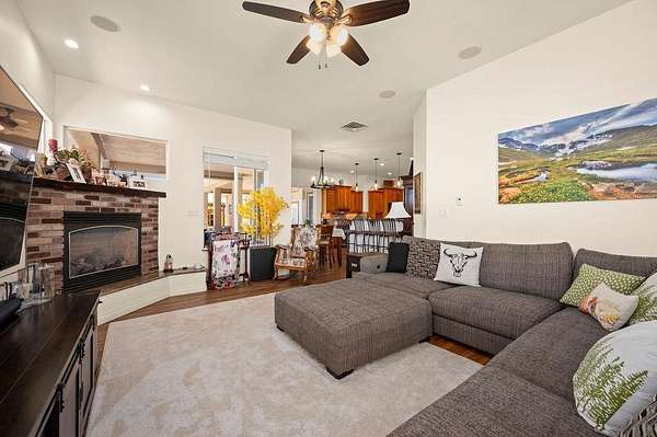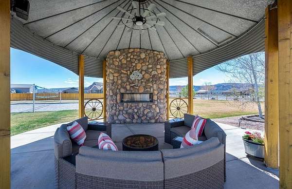 Welcome to this beautiful, bright and airy ranch-style home featuring 4 bedrooms, 4 bathrooms, a 3-car garage plus a fully equipped shop, all set on 2.01 acres. The 42x48 insulated shop is designed for versatility with heating and cooling, 220 electrical, two 14' overhead doors, two 8' doors, and a 3/4 bath-ideal for a variety of uses. The property also includes full RV hookups along with plenty of parking for RV's, trailers, etc. Inside, the open-concept layout is filled with natural light from large windows and complemented by 10' and 12' ceilings throughout. Features include in-floor heat, two Breeze Air coolers, central vacuum, and built-in surround sound speakers for added comfort and convenience. Outdoor living is a standout with an expansive covered patio, additional open patio with firepit, outdoor kitchen, and a sand volleyball pit. A unique silo has been converted into a seating area with a gas fireplace, creating a distinctive gathering space. A hot tub is also included for relaxation. A new roof adds to the overall value, while the acreage provides room to spread out and enjoy a variety of outdoor activities. This property combines space, functionality, and a wide range of amenities in one setting.
