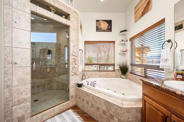 - Ceiling Fans, Central Vacuum, Garden Tub Roman Tub, Granite Counters, Main Level Primary, Pantry, Sound System, Walk In Closets, Walk In Shower, Window Treatments, Wired For Sound