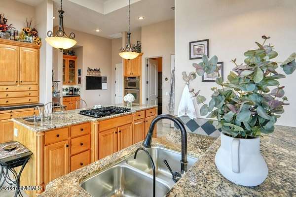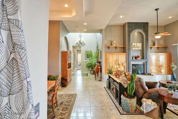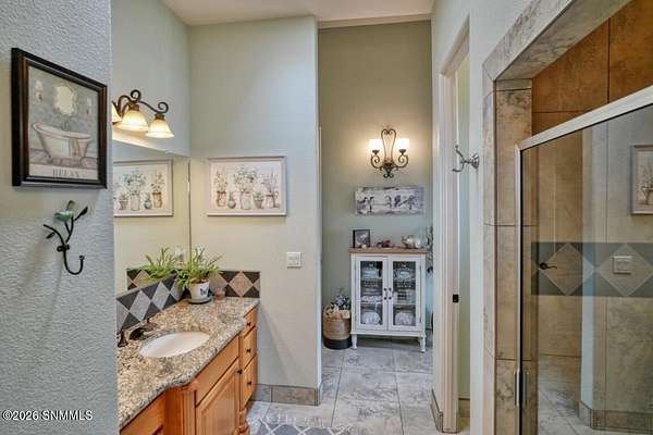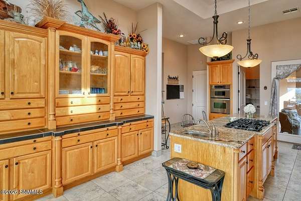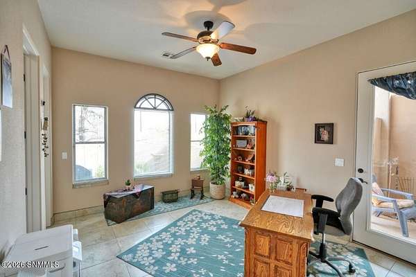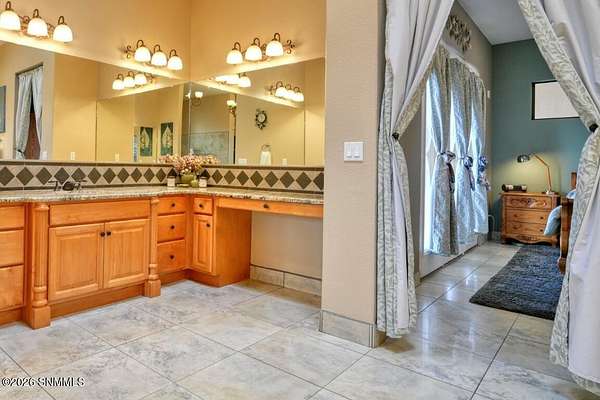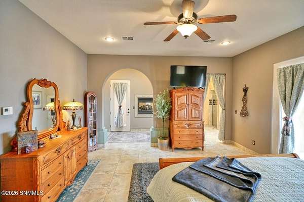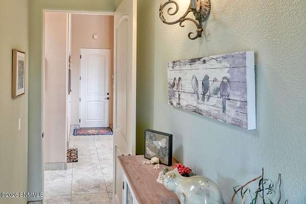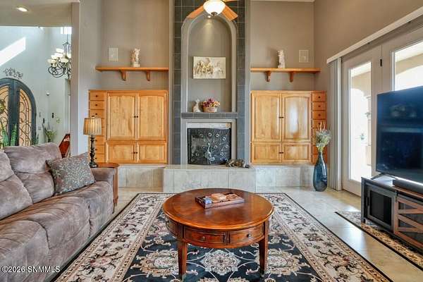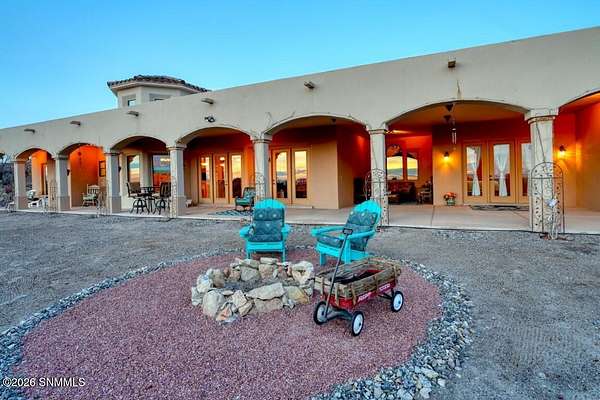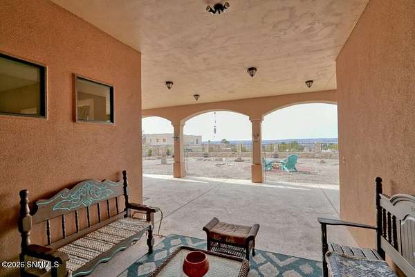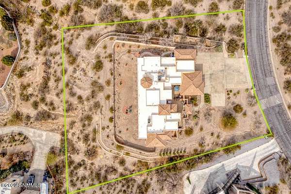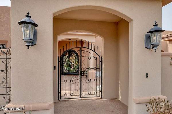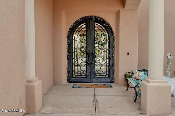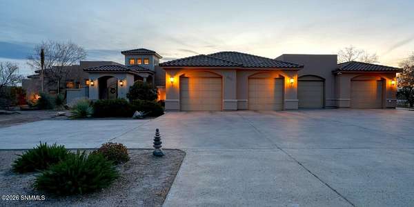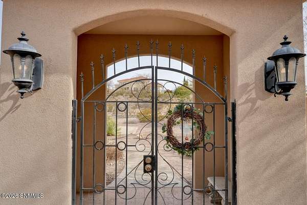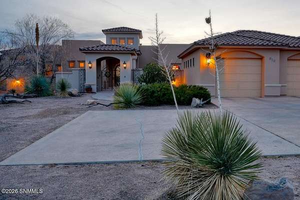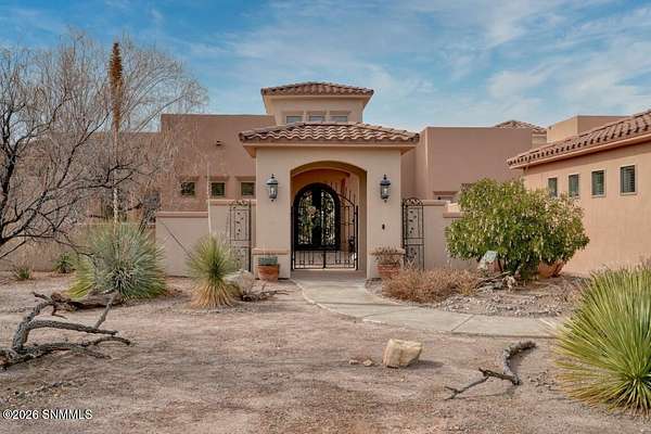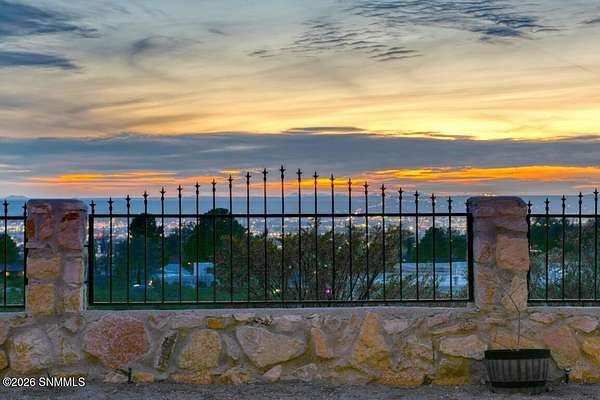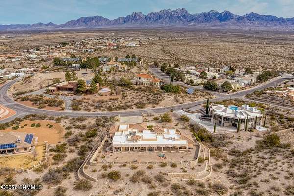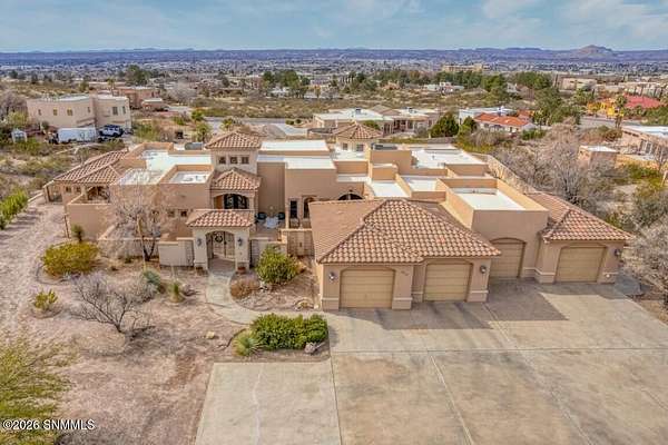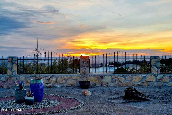 Perched to capture expansive views, this custom home offers dramatic sunsets, sweeping Mesilla Valley vistas, and a nightly city-light display, along with a front-row seat to 4th of July fireworks. Situated on approximately 1.5 acres, the property combines elevation, openness, and generous outdoor space while remaining close to city conveniences. The home is designed around multiple courtyards, each offering a distinct outdoor setting for everyday enjoyment. Abundant natural light fills the interior, enhancing every room. A full-length covered back patio and easy backyard access extend the living space outdoors, complemented by natural desert landscaping and wonderful wildlife sightings. An oversized four-car garage with workshop area provides exceptional flexibility. Each bedroom includes a walk-in closet and direct access to its own bathroom, and the laundry room offers ample counter space, cabinetry, and a utility sink. Located near BLM open space with extensive hiking and mountain-biking trails.