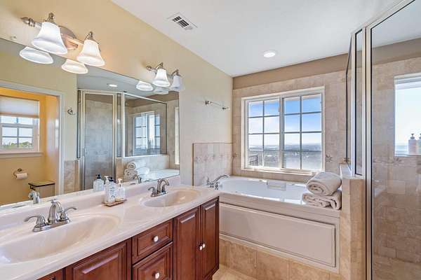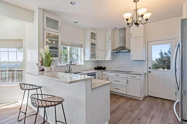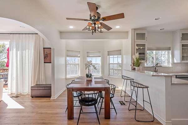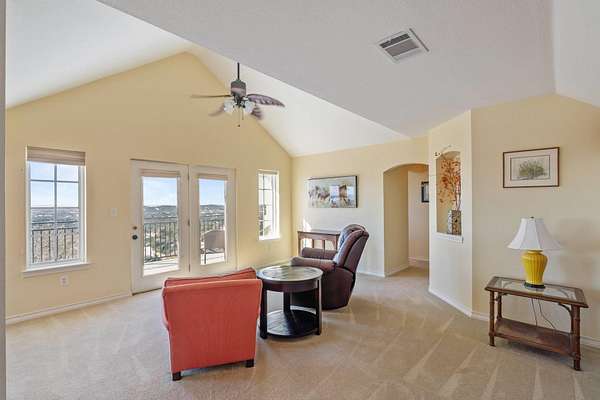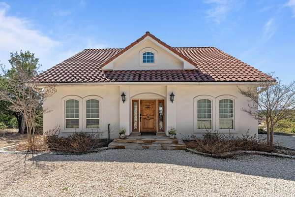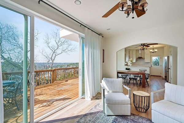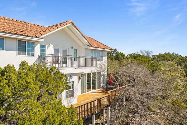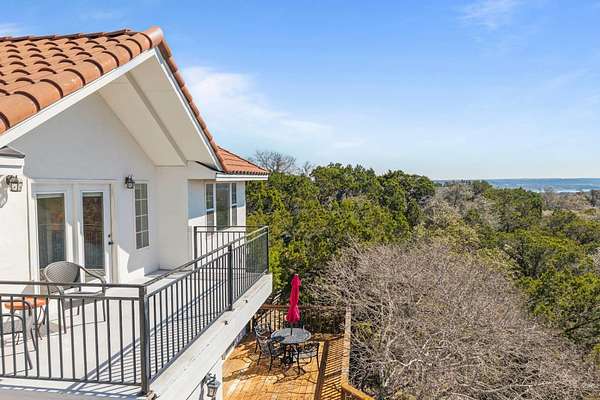 Perched high on a private hillside, this unique property offers sweeping 180-degree views of Lake Travis and the surrounding Hill Country. Situated on 2.3 acres, the low-maintenance three-bedroom, two-bath home combines privacy, natural beauty, and comfortable living with scenic vistas from nearly every room. Large windows throughout the home fill the interior with natural light while framing breathtaking views from the living areas, kitchen, dining space, and primary suite. The open-concept kitchen features abundant cabinetry, quartz countertops, stainless steel appliances, and a breakfast bar that flows easily into the dining area-perfect for gathering while enjoying the scenery. Outdoor living is a highlight, with expansive decks on both levels that capture panoramic lake and Hill Country views. Whether enjoying morning coffee, sunset dinners, or quiet evenings under the stars, the decks create an ideal setting for relaxing and entertaining. The spacious primary suite includes a private sitting area and its own deck overlooking the landscape, offering a peaceful retreat with remarkable views. The primary bathroom features dual vanities, a soaking tub positioned beneath a large picture window, and a separate walk-in shower. The property has successfully operated as a STR, with the popular Villa Antonia wedding venue located nearby. Outdoor enthusiasts will appreciate easy access to Lake Travis with two public boat launches in nearby Jonestown. Enjoy bird watching, hiking, and the relaxed Hill Country lifestyle, with live music and entertainment frequently hosted at the local favorite Lucky Rabbit. Schedule a showing today!