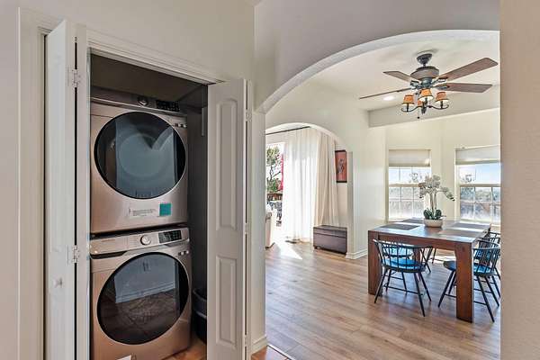 - Breakfast Bar, Ceiling Fan(s), Ceiling-High, Ceiling-Vaulted, Chandelier, Double Vanity, Eat-In Kitchen, Entrance Foyer, High Speed Internet, In-Law Floorplan, Interior Steps, Open Floorplan, Pantry, Quartz Counters, Recessed Lighting, Soaking Tub, Stackable w/ Connections