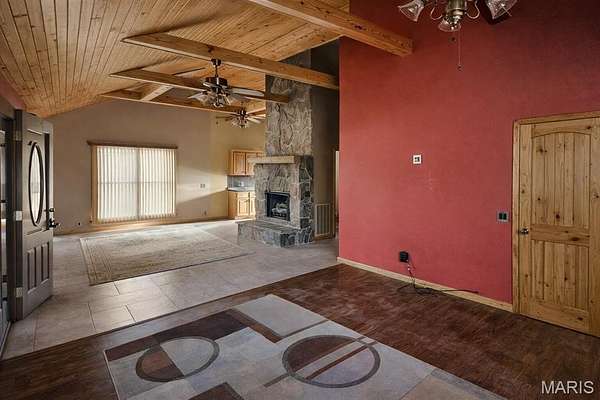 Situated on 4 picturesque acres, this distinctive rural property offers privacy, versatility, and character. The front yard is accented by beautiful mature pine trees, while the expansive rear yard is fully fenced with chain-link--ideal for animals, recreation, or safe play area for kids. Inside, the home features an open living area with soaring ceilings, exposed wood beam accents, and a striking floor-to-ceiling stone gas-log fireplace that serves as a dramatic focal point. The kitchen offers warm wood cabinetry and flows seamlessly into the main living space, creating an inviting atmosphere for everyday living or entertaining. A one-car tuck-under garage adds convenience, while the two-car detached garage includes a charming 2-bedroom, 1-bath apartment upstairs--perfect for guests, extended family, or rental potential. An excellent opportunity for horse owners or those seeking a peaceful mini-farm lifestyle.