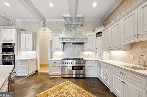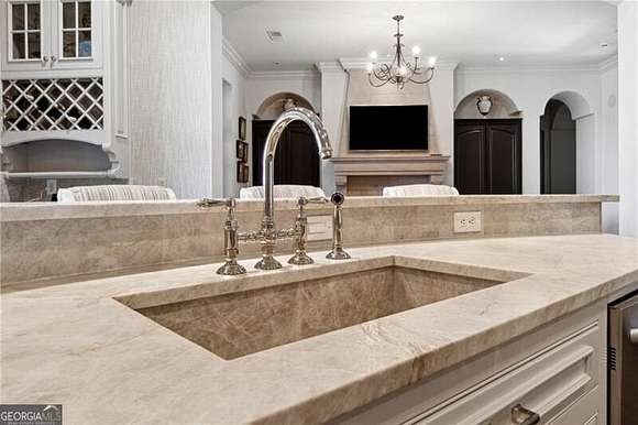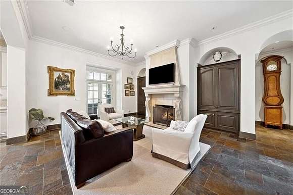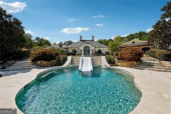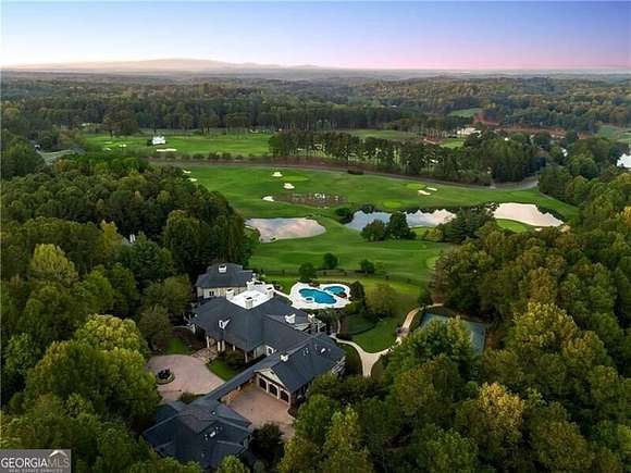 Extraordinary 20,000+ sq ft estate in the Hawks Ridge Golf Course community sits on 8 landscaped acres and features a European-inspired design with a private recording studio. With 8 bedrooms, 9 full baths, and 3 half baths, it offers a perfect blend of luxury interiors and resort-style outdoor living. Conveniently located, it's just 5 minutes from shopping/dining, 10 minutes to Milton, 45 minutes to Buckhead, or 15-20 minutes by helicopter. Cherokee County Regional Airport is only 15 minutes away, making Nashville just a 1-hour flight, offering incredible accessibility for any travel needs. Upon arrival, the estate makes a grand statement with its security gate leading to a circular entry courtyard, offering easy access to the main home, studio, 5-car garages, and guest cottage. Inside, soaring ceilings, rich architectural details, and timeless sophistication await. The formal living room boasts vaulted ceilings with wood beams, expansive arched windows, and a grand limestone fireplace, while travertine floors and custom chandeliers elevate the elegant atmosphere, making it perfect for both intimate gatherings and large-scale entertaining. The recently remodeled gourmet kitchen is a chef's dream, featuring Taj Mahal Leather Quartzite countertops, a limestone range hood, and high-end Thermador and Subzero appliances. The light cabinetry, slate flooring, and grasscloth wallpaper create a refined and functional space, and the large island offers ample seating for casual dining, making this the heart of the home for family and friends. The nearly 3,000 sq ft main-level primary suite offers a serene retreat, with a Juliette balcony overlooking the pool, outdoor entertaining area, and golf course. The primary bath includes dual vanities, a steam shower, a soaking tub, and separate commodes. Two oversized walk-in closets, including a two-story custom closet, provide abundant storage, while the adjoining wood-paneled office/library adds function and elegance. The outdoor living spaces are truly spectacular and include a resort-style pool with multiple levels, an elevated hot tub, and a central water slide. A travertine pool deck is surrounded by lush landscaping and vibrant flower beds, creating a picturesque and tranquil environment. For those who love to entertain, the property offers multiple outdoor kitchens, dining areas, fireplaces, and a private tennis and basketball court. The terrace level is entertainment-focused, with a professional movie theater featuring fabric paneling, a hand-crafted custom bar, meticulously carved by a master carpenter, and overlooking a large game room and living room. Additional amenities on this level include a gym, massage room, craft room, and two ensuite guest bedrooms. For music enthusiasts, the multi-million-dollar recording studio features a live room, control room, and vocal booth all floated and with Overly doors for superior acoustics, offering a world-class private space for music production. The estate is completed with a two-bedroom and two-car garage guest house, providing privacy for visitors or extended family. The attention to detail extends throughout the property, from the balconies and terraces to the timeless finishes and breathtaking views of Hawks Ridge Golf Course. Hawks Ridge Golf Club is a prestigious 18-hole private golf course designed by Bob Cupp. Spanning 550 acres of rolling hills and lush greenery, this 18-hole championship course combines natural beauty with challenging play. The course features undulating terrain, pristine water hazards, and scenic landscapes that offer diverse shot opportunities. Known for its bent-grass greens and the iconic waterfall at the fifteenth hole, Hawks Ridge provides a world-class golf experience in a serene, secluded environment. It is a non-equity, private club with a grand clubhouse, fine dining, locker rooms, and a helicopter pad for added convenience, set within an exclusive community.