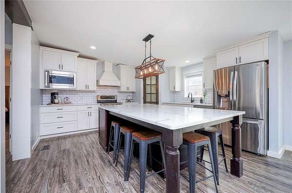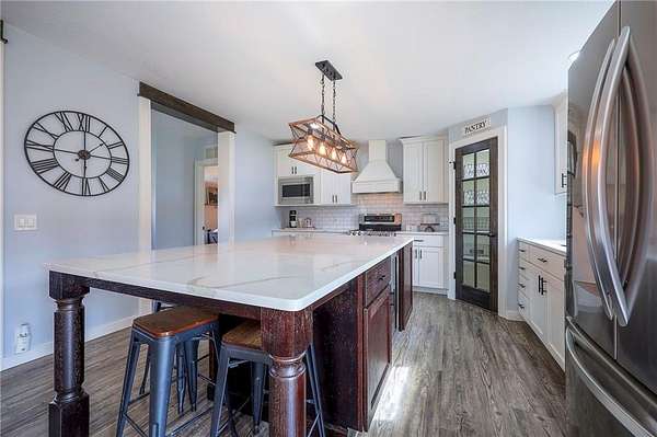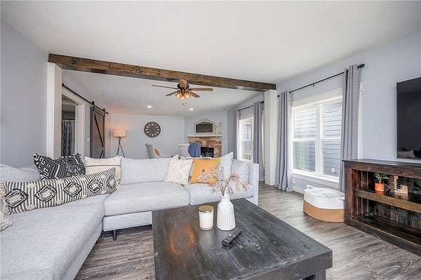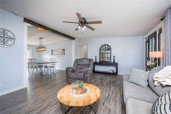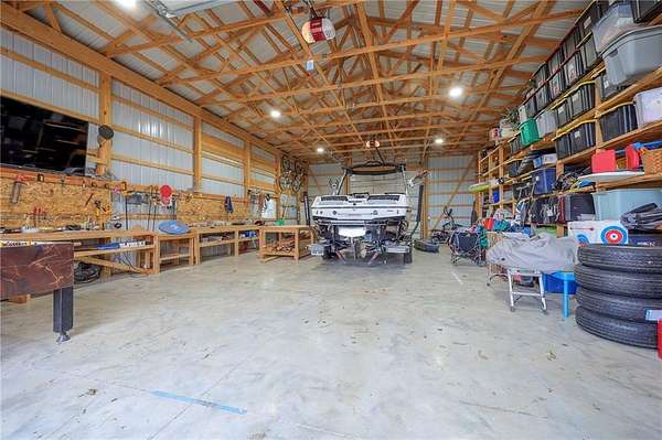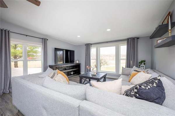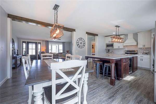 Spacious, fully remodeled one-story home situated on a stunning 5-acre lot featuring a private pond and incredible outdoor amenities. As you arrive, you're welcomed by a long private drive leading to a beautifully updated property complete with a newly added 3-car garage, connected by an extended mudroom hallway with a custom walk-in closet and outdoor-access bathroom-perfect for entertaining guests or enjoying the land. Inside, the home offers a bright, open floor plan with a large kitchen island that comfortably seats five, ideal for gatherings. You'll find two spacious living areas, 4 bedrooms, and 2 full bathrooms, providing both functionality and flexibility. Recent updates include a newer roof, windows, and extensive remodeling throughout. Step outside to enjoy the large covered front porch overlooking the pond, and in the back, you will find enclosed dog run, covered patio and a brand-new barn with fire pit area, creating the perfect setup for both relaxation and recreation. Peaceful, private, and move-in ready-this property truly offers the best of country living with modern updates.