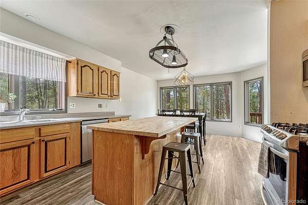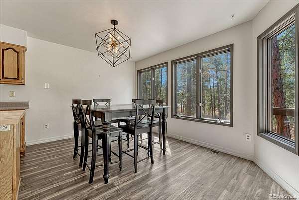 Nestled on over 5 acres in the highly sought-after Pinewood Knolls community of Franktown, this property offers a rare opportunity to create your ideal Colorado retreat. Surrounded by mature trees and natural landscape, the setting provides exceptional privacy and a peaceful, forest-like environment. The home features a multi-level layout with abundant natural light, a spacious great room with gas fireplace, and a finished walk-out basement offering flexible living space. The kitchen includes a gas range/oven, butcher block island, hardwood flooring.