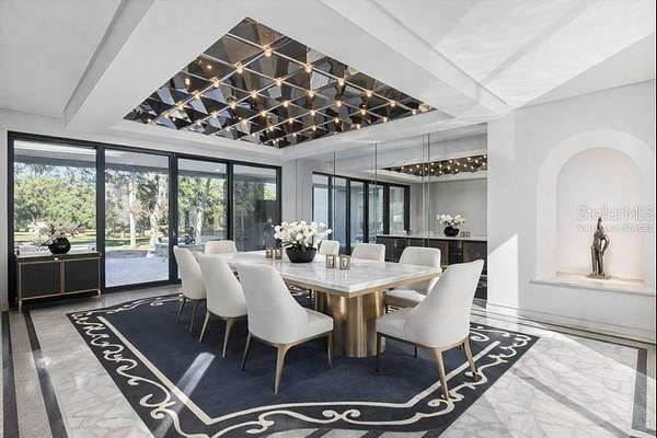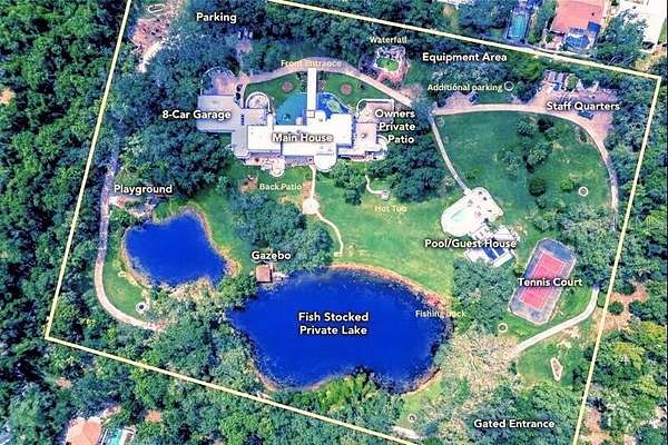 One or more photo(s) has been virtually staged. Presenting The Fortress, a one of a kind architectural masterpiece created for those who understand that true luxury is not styled but built to endure and remain irreplaceable. SET ON NEARLY 12 ACRES and designed and constructed over 7 years by the world renowned architectural firm HHCP for Harold Mertz, billionaire founder of Publishers Clearing House, this nearly 20000 square foot private compound has hosted presidents, global dignitaries, private concerts, and philanthropic gatherings of the highest caliber. Approached by a quarter mile tree lined driveway, the fully walled estate centers around a 5 acre private lake spring fed by the Wekiva Springs State Park, surrounded by museum quality grounds featuring imported European fountains, life size bronze sculptures, curated statuary all across the gardens, and ornamental ponds suitable for koi fish. The main residence spans 14623 square feet and offers 7 bedrooms each with its own full bathroom, along with an elegant powder room by the main entrance, formal living and dining rooms, a breakfast room, a main kitchen, and a separate staff kitchen. Constructed of solid poured concrete, the home reflects permanence and security with bulletproof glass, hand plastered walls, soaring 25 foot ceilings, graceful arches, and signature fluted architectural textures expressed through curved nonlinear walls. A massive custom bronze door opens to interiors finished in polished marble and terrazzo flooring, including brand new floors in the main living room and kitchen, which features panoramic lake views, an oversized island, oversized pantry, private service entrance, and a fully equipped staff kitchen with its own dining area. Four bedrooms are located upstairs with the most impressive lake views and three bedrooms downstairs, while a monumental round atrium crowns the sculptural marble staircase that took 2 full years to complete. Additional highlights include a dramatic 2 story library that converts into a home theater, a glass conservatory with a Murano chandelier designed for a grand piano, an elevator near the foyer, 2 authentic wood burning fireplaces, custom Sherle Wagner bathrooms, hidden closets throughout, and a bar near the piano room. The West wing principal suite features a private Italian inspired alfresco patio and an adjacent private gym with a full bathroom, sauna, and walk in closet, creating a self contained wellness retreat, while the East wing suite enjoys its own Italian inspired patio. The estate is completed by an approximately 2500 square foot guest and pool house with 2 bedrooms and 2 full bathrooms, staff quarters of approximately 1000 square feet, a 2300 square feet 8 car garage with full bath, laundry, and storage, along with resort style amenities including a pool and spa, a professional court lined for tennis and pickleball, a Hot Tub, sandy beach access, and multiple alfresco entertaining areas, this home has countless custom invaluable features, making The Fortress a true legacy estate built to stand for the next century and beyond. Conveniently located near top rated schools, 2 miles away from Wekiva Springs Park, leading hospitals, Golf Courses and an array of elevated dining experiences, offering effortless access to education, healthcare, and refined lifestyle amenities while preserving privacy and exclusivity. Private showings are offered by appointment only.
