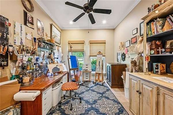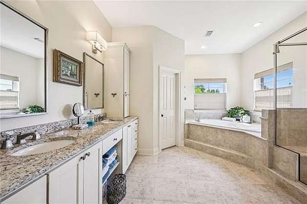 Inside, soaring ceilings, abundant natural light, and warm wood flooring create an inviting and refined atmosphere. The thoughtfully designed single-story floor plan offers both privacy and functionality, with a spacious primary suite featuring a spa-inspired bath, soaking tub, custom shower, and generous walk-in closet. A separate bedroom wing provides comfort for family or guests, while a dedicated study/bonus space offers flexibility for working from home or hobbies.
